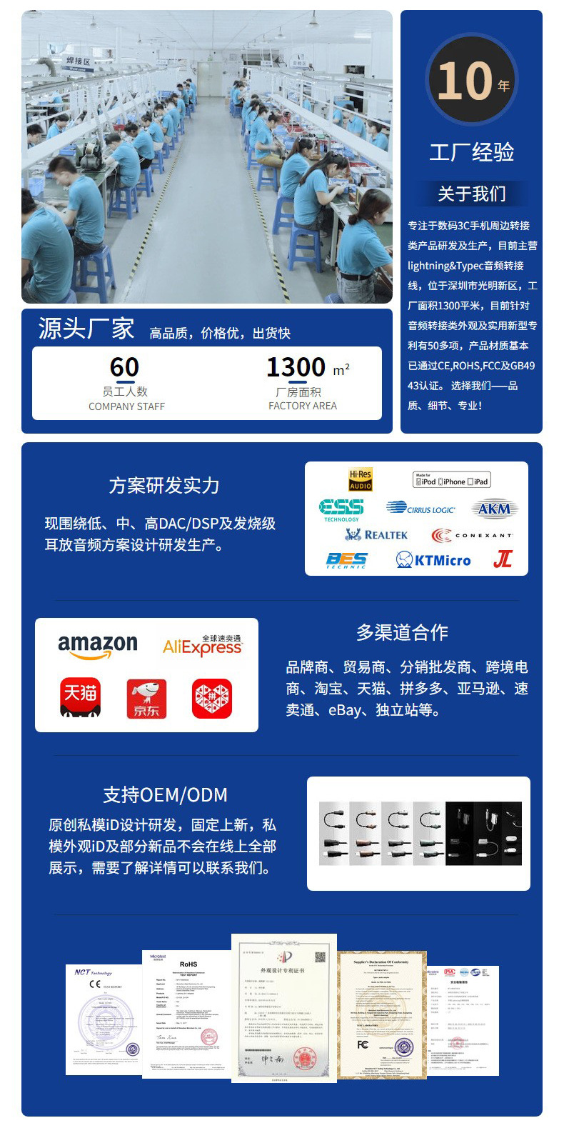 我们承诺售前售后一样的配合度,尽全力保证好的质量。工厂专业生产各种type-c音频转接类,专业的外观ID设计团队,给力方案芯片开发后盾,专注3C类制造10年工厂。现围绕低、中、高、DAC、发烧音频产品及周边产品设计研发生产,愿与您携手共进。