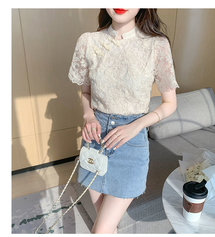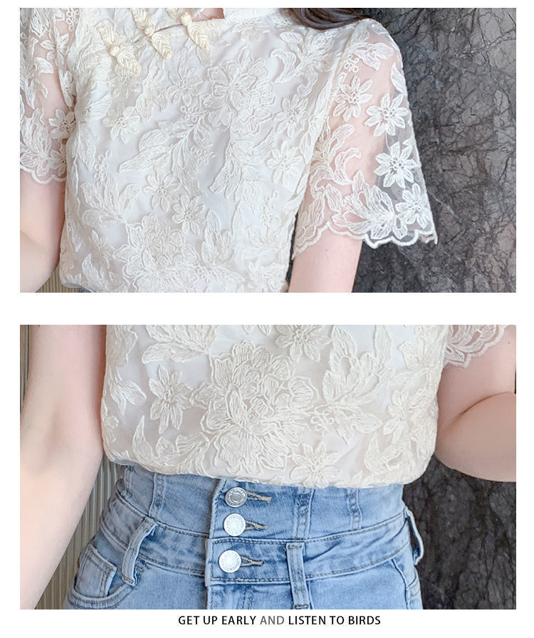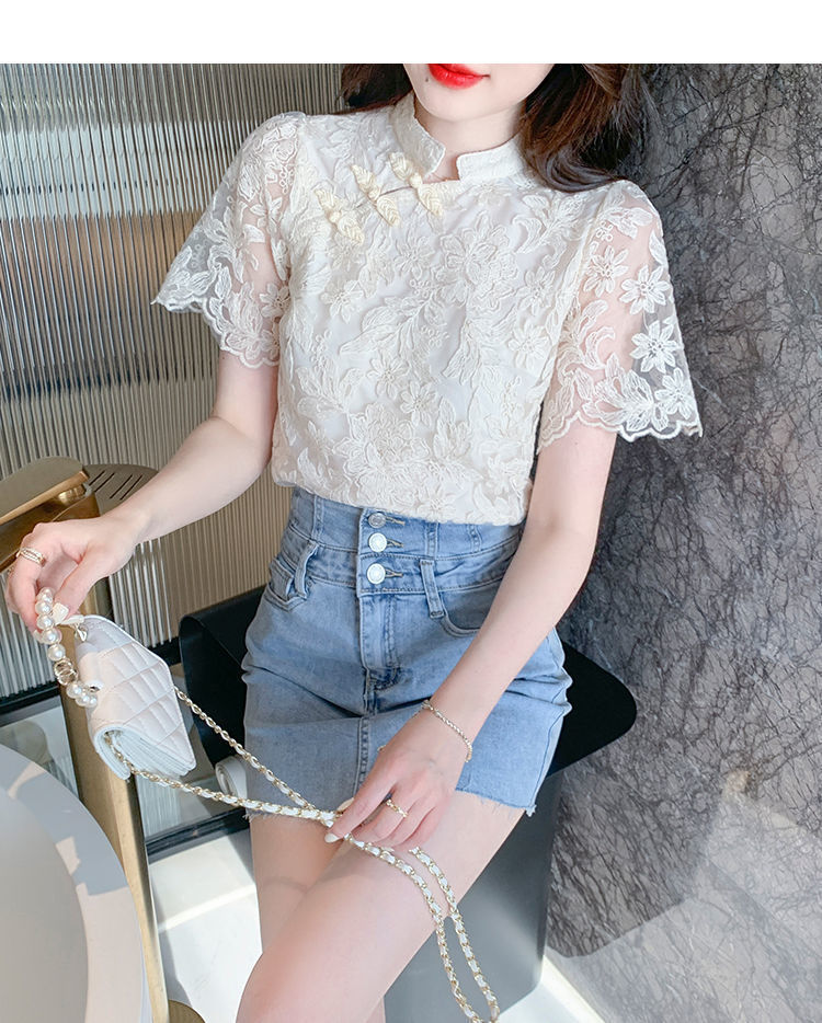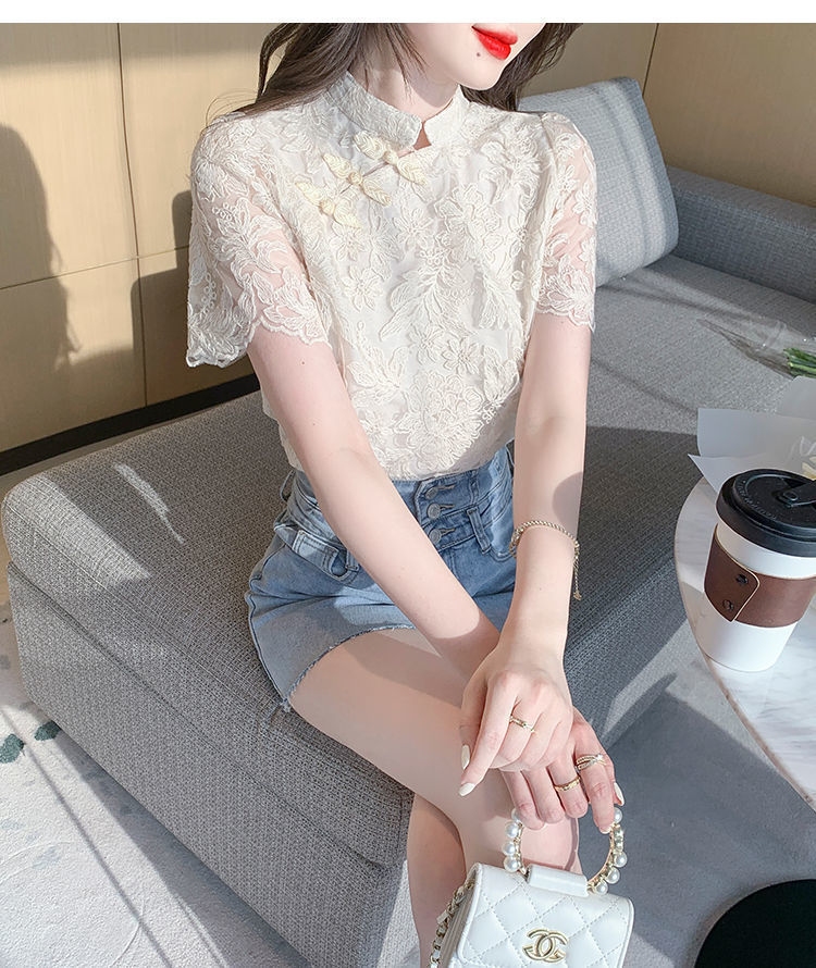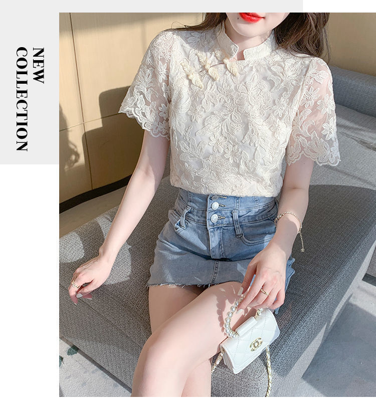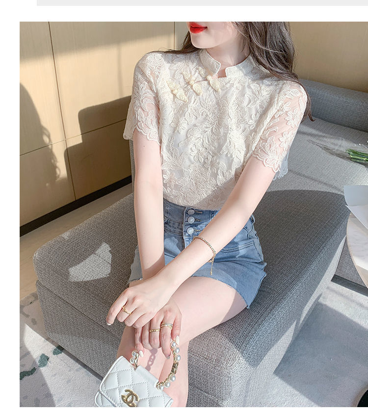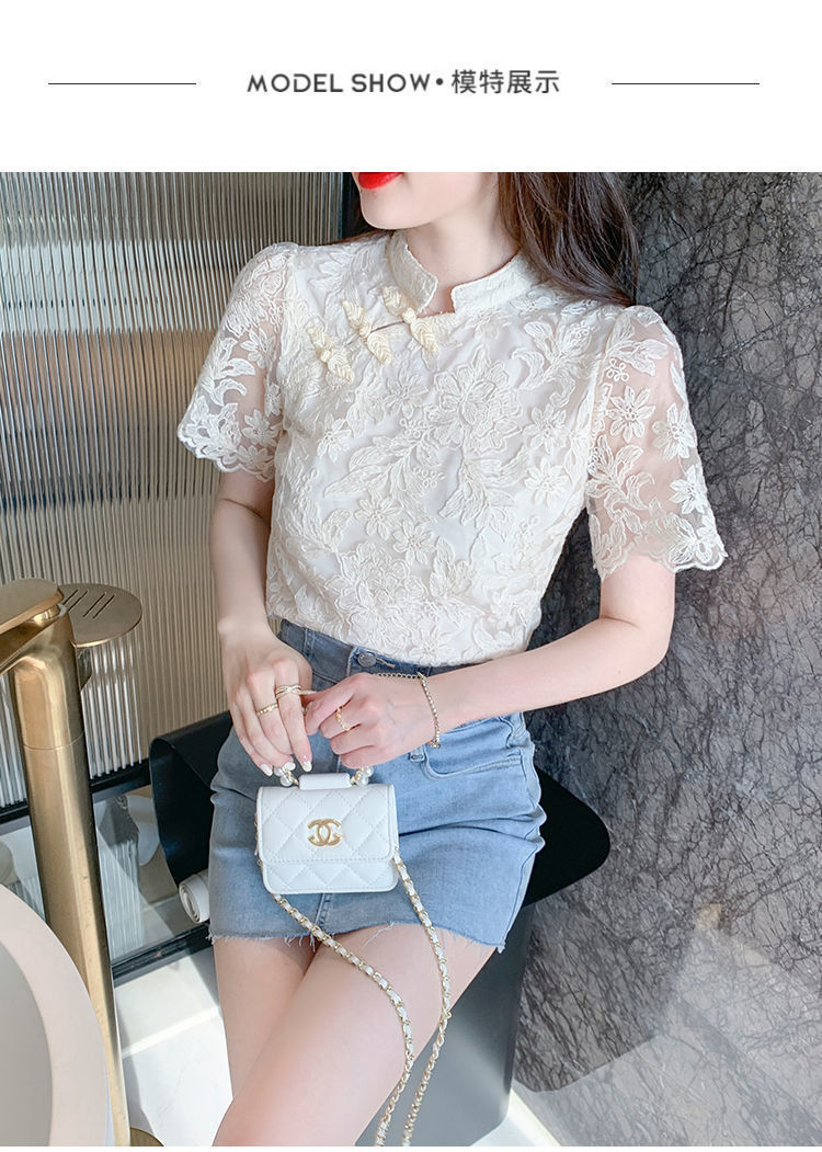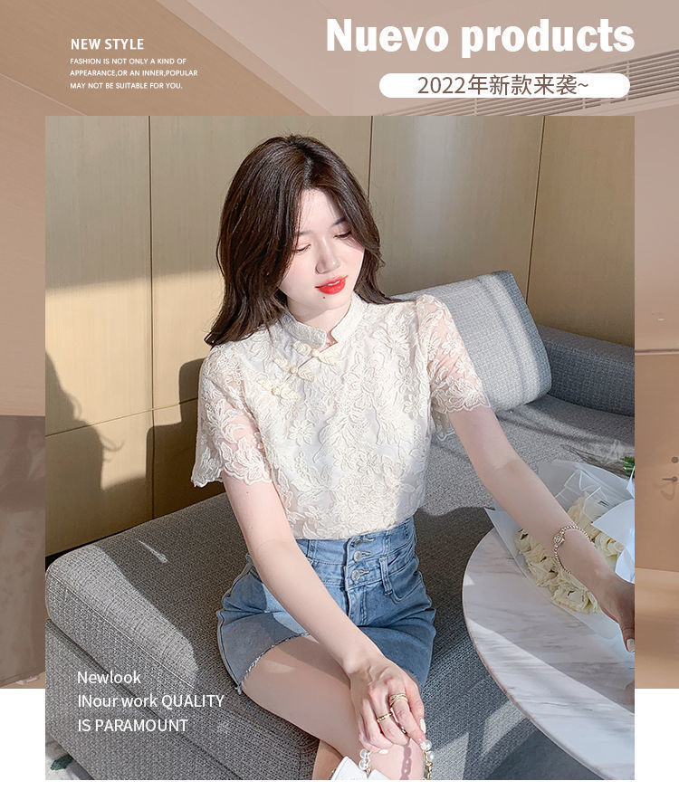 여름 외국 스타일 반팔 쉬폰 셔츠 여성 여름 2022 새로운 레이스 치파오 탑베이스 셔츠