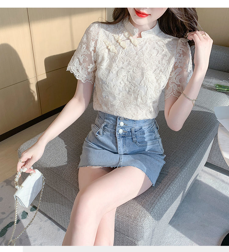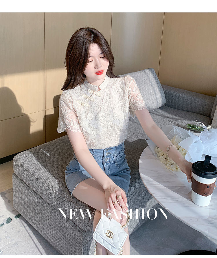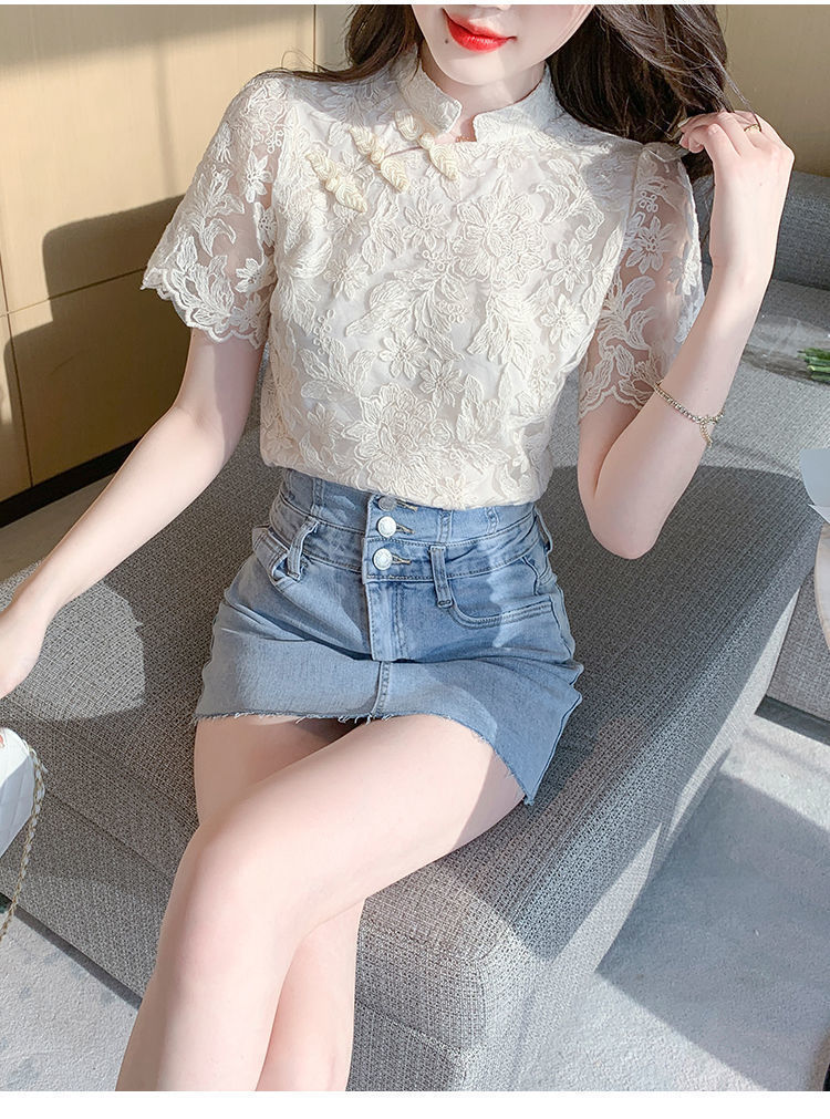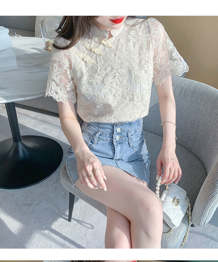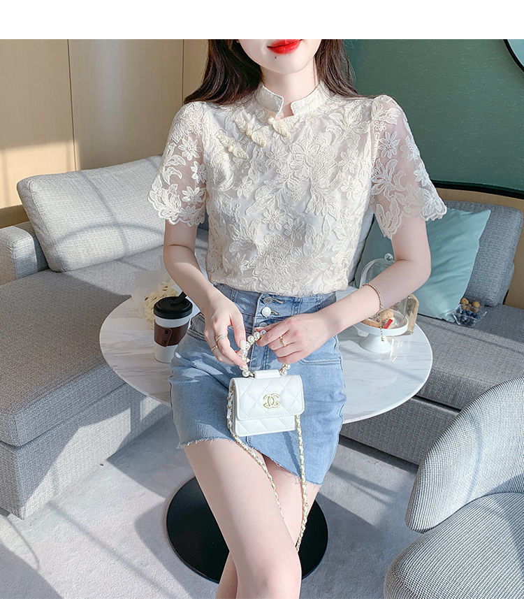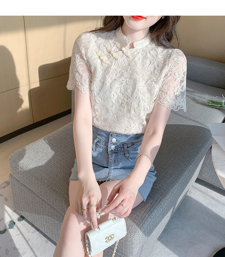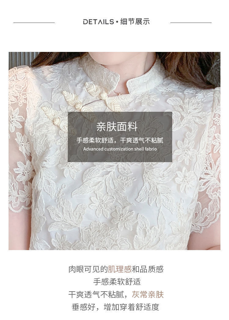 여름 외국 스타일 반팔 쉬폰 셔츠 여성 여름 2022 새로운 레이스 치파오 탑베이스 셔츠