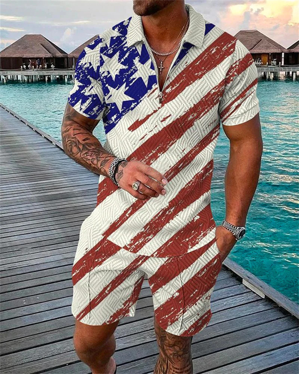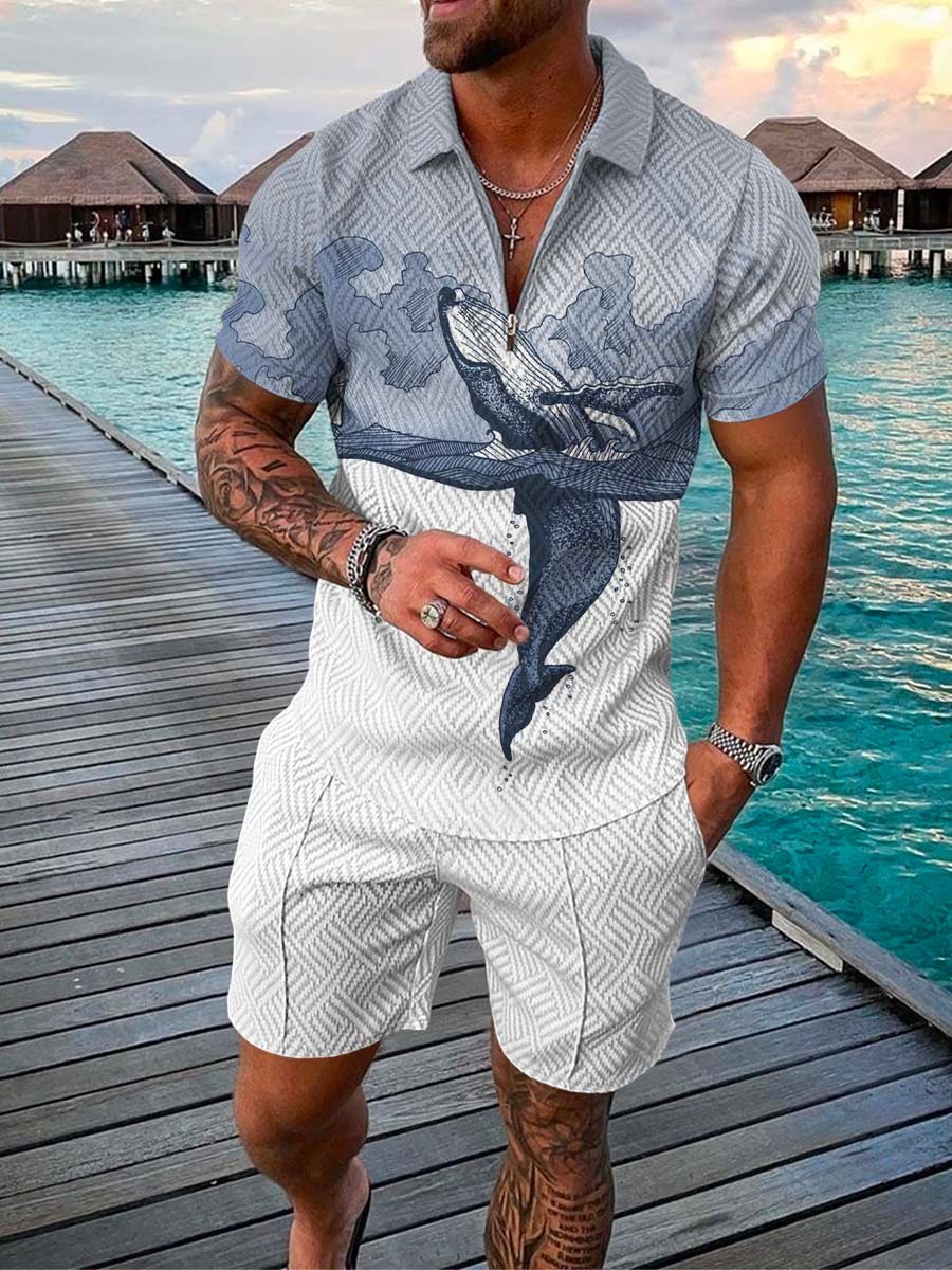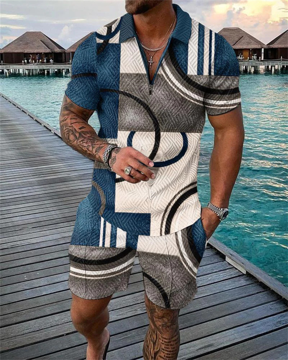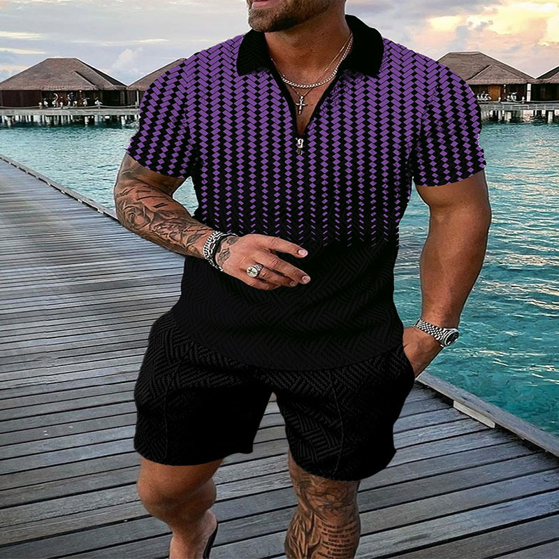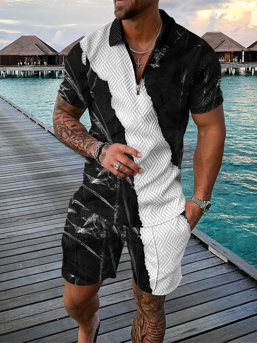 2022 국경 간 유럽과 미국의 새로운 독립 역 공급 캐주얼 대비 컬러 POLO 지퍼 POLO 셔츠 짧은 소매 세트