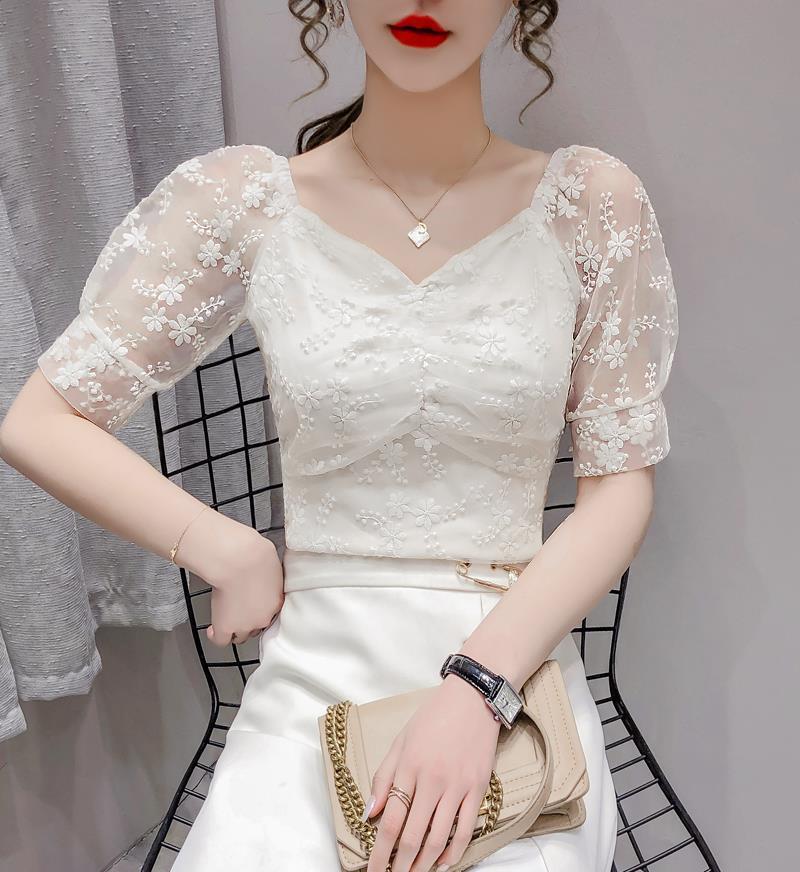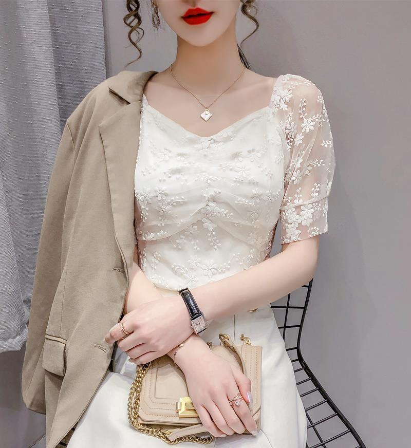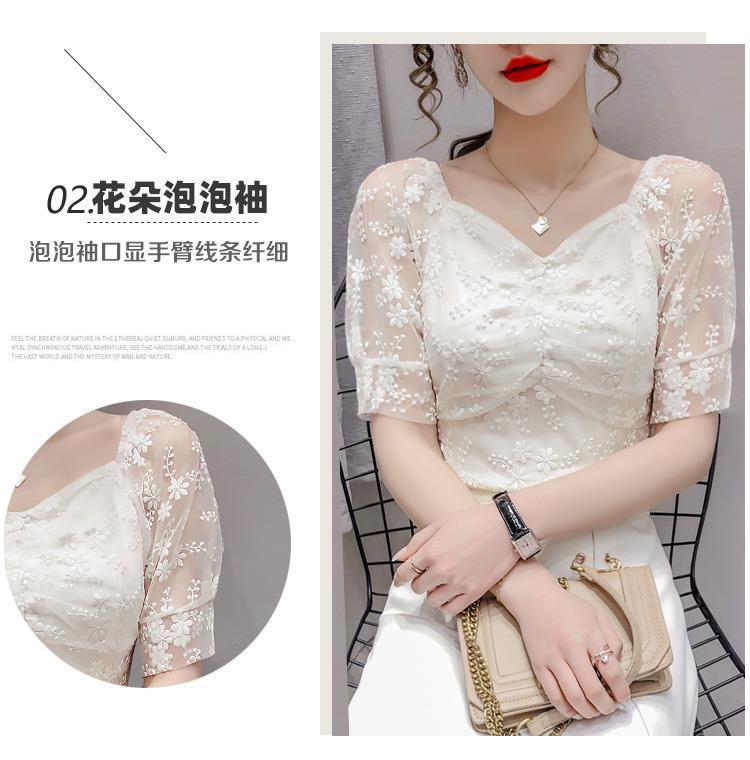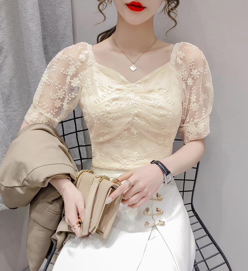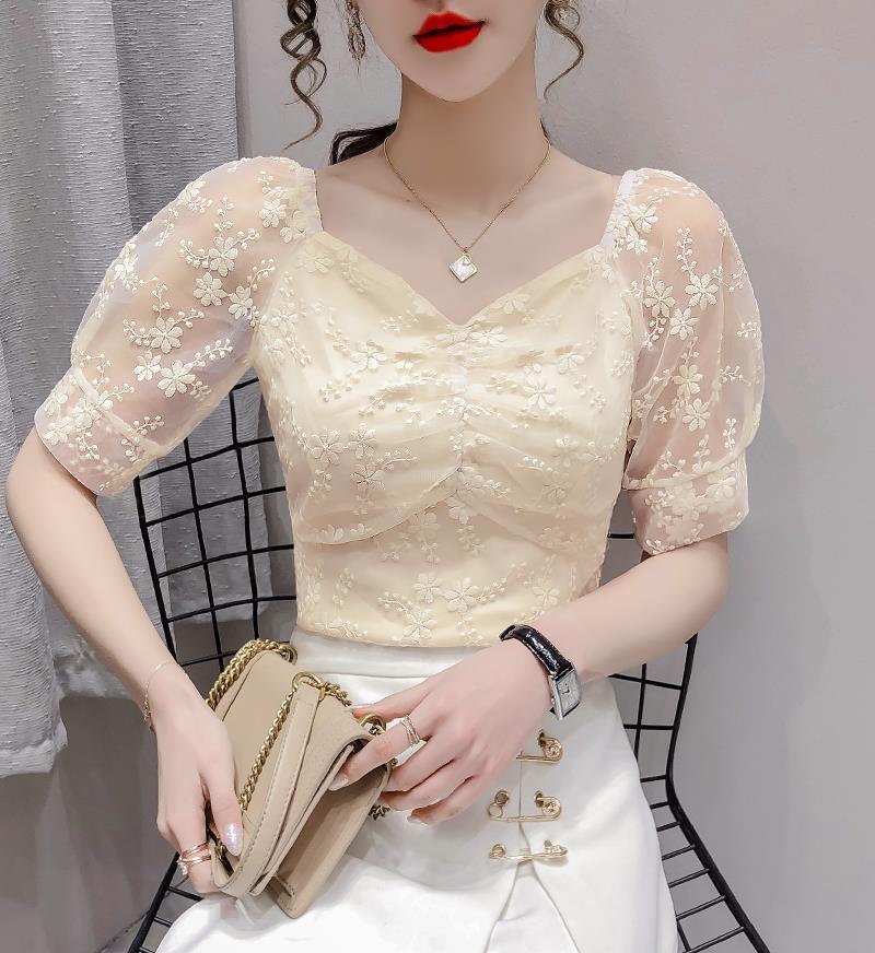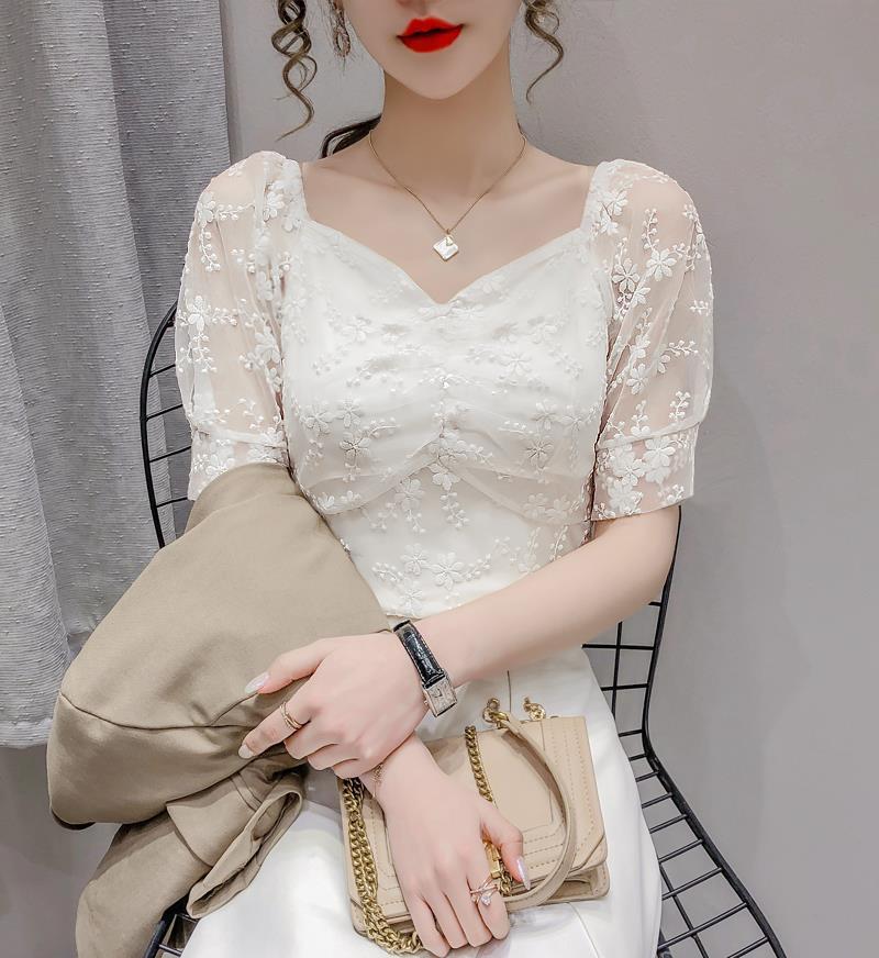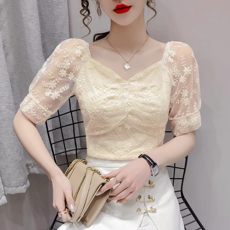 여성용 자수 레이스 셔츠 여름 새로운 슬림 핏 짧은 메쉬 퍼프 소매 오프 숄더 서양식 반소매 쉬폰 탑스토어 가기