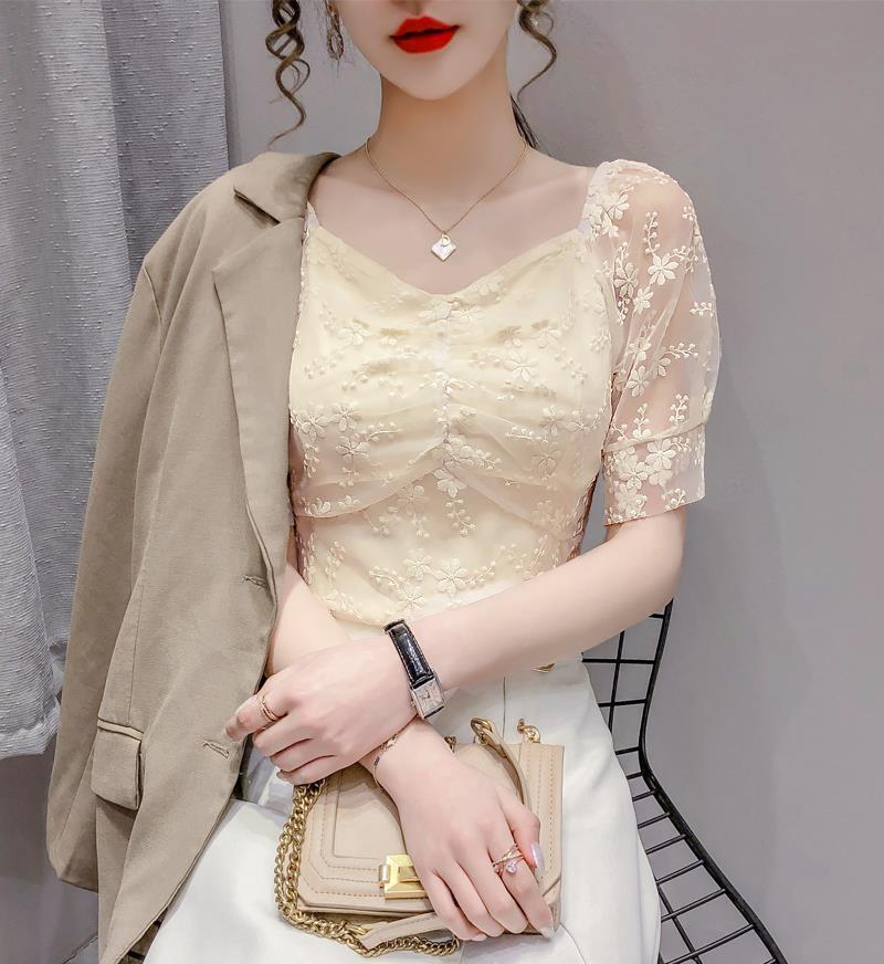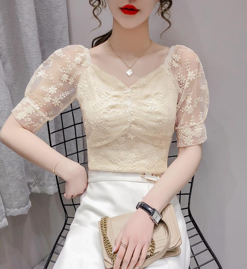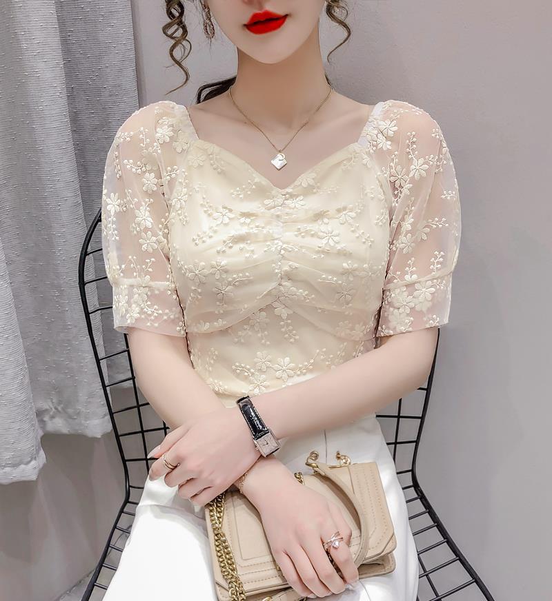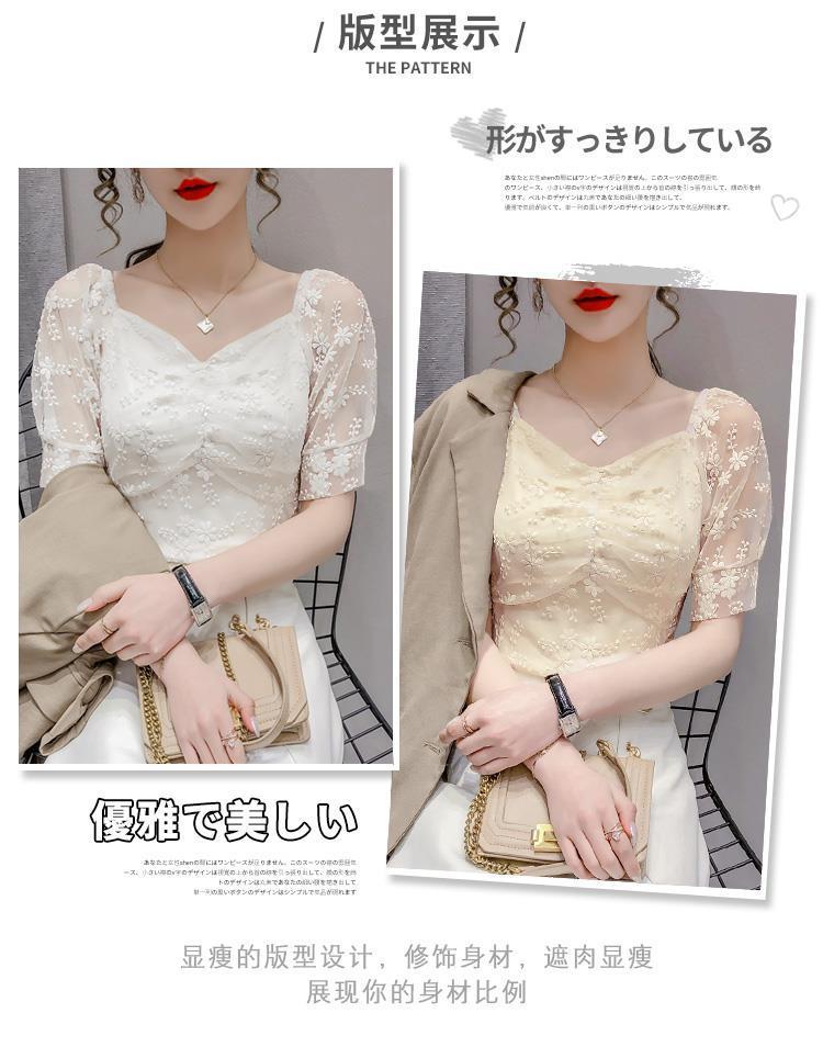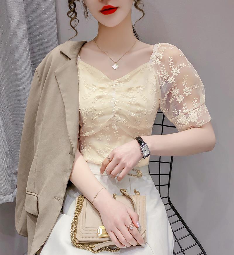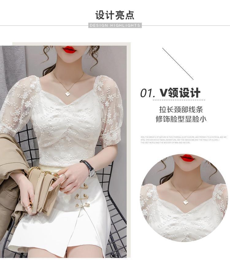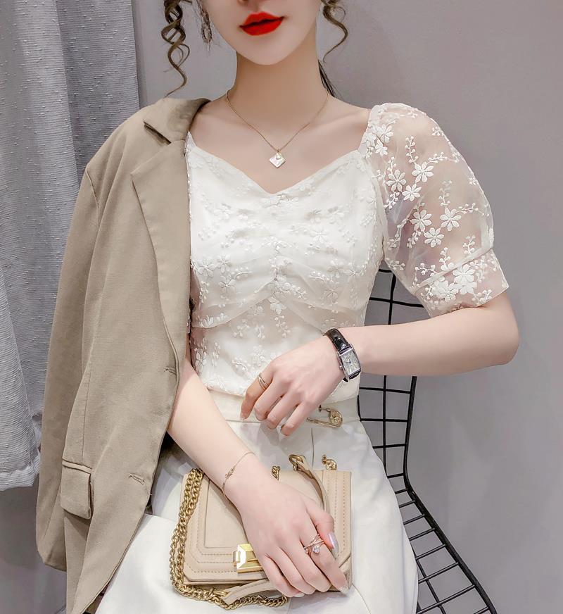 여성용 자수 레이스 셔츠 여름 새로운 슬림 핏 짧은 메쉬 퍼프 소매 오프 숄더 서양식 반소매 쉬폰 탑스토어 가기