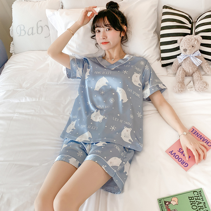 얼음 실크 잠옷 여자의 반팔 여름 얇은 만화 학생 귀여운 실크 투피스 세트 봄과 가을 여름 가정 의류