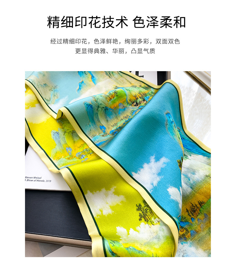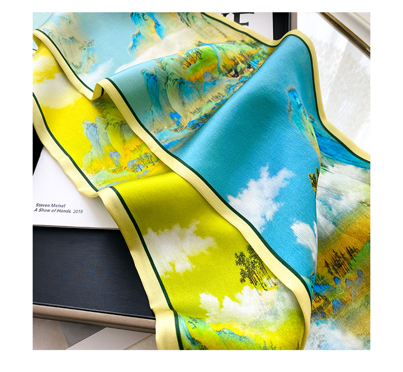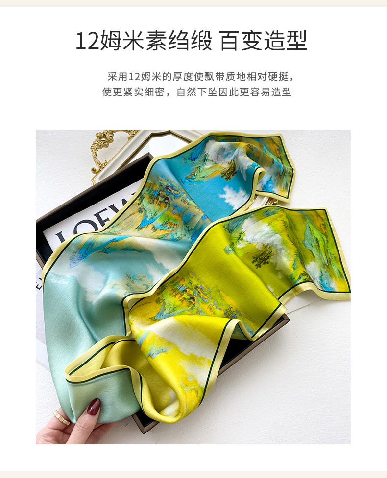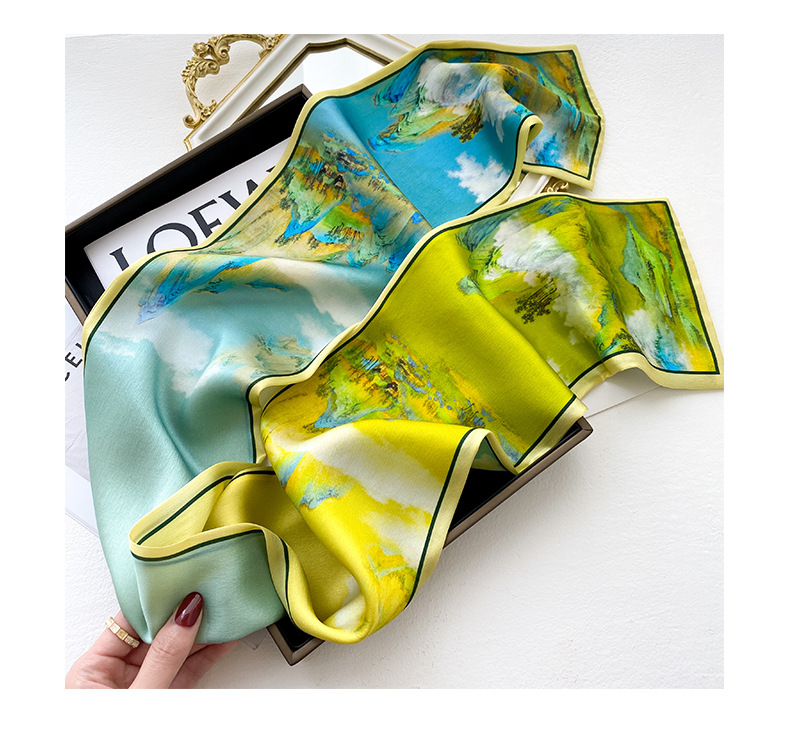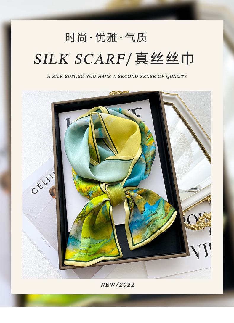 여름 블루 그린 그라디언트 유화 더블 레이어 뽕나무 실크 스카프 리본 여성용 긴 스카프 넥타이 가방 봄과 가을 플랫 혼 스카프스토어 가기