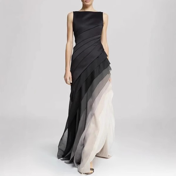 2021 유럽과 미국의 거즈 원피스 다층 무거운 작업 원피스 높은 허리 긴 원피스 단색 검은 기질 통근 원피스 스커트