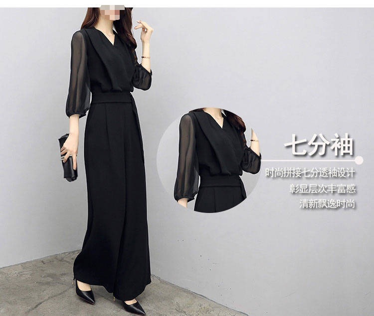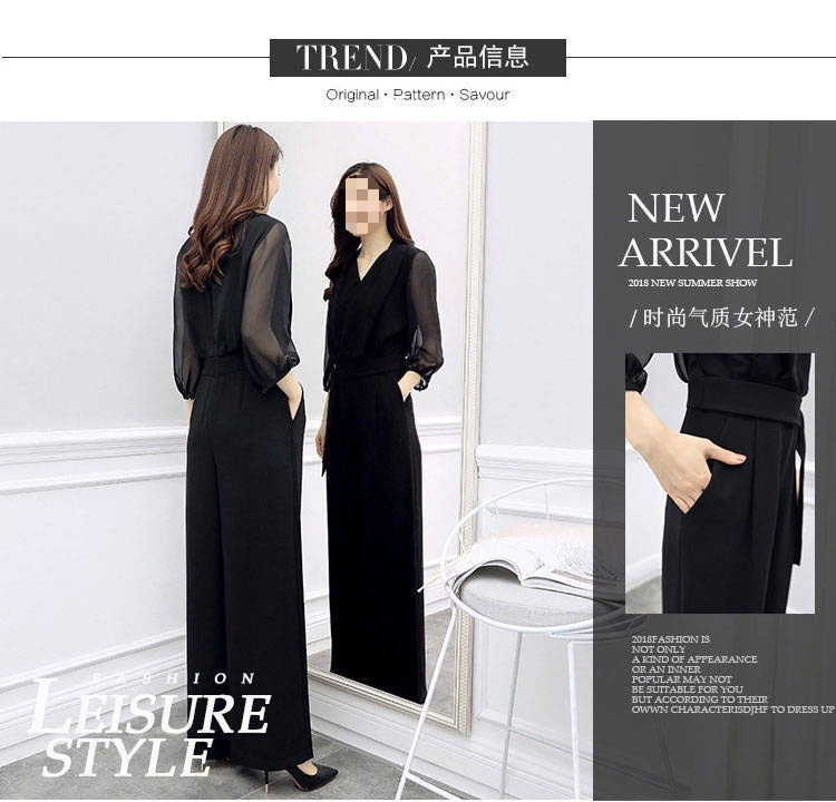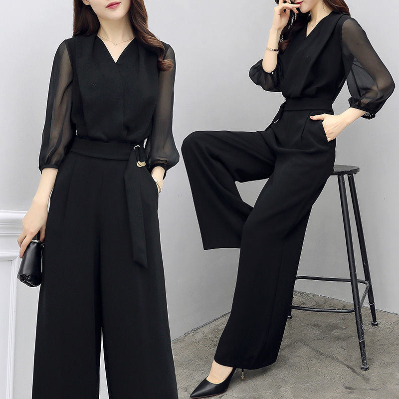 봄과 여름 새로운 하이 웨이스트 캐주얼 점프 슈트 블랙 크롭 슬리브 슬림 핏 슬리밍 우아한 와이드 레그 점프 슈트 세트 여성스토어 가기