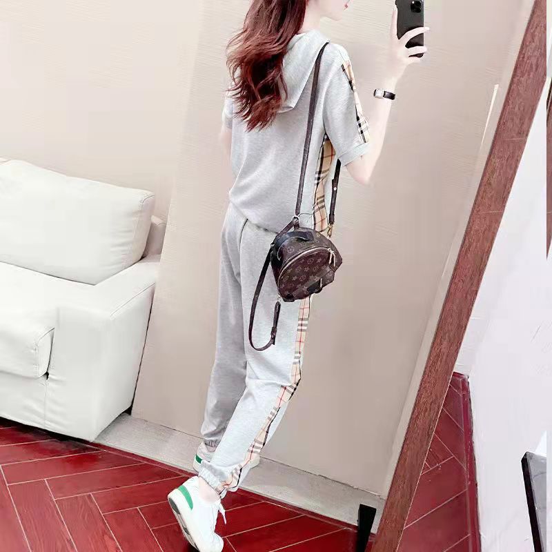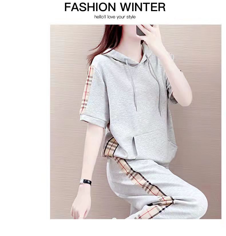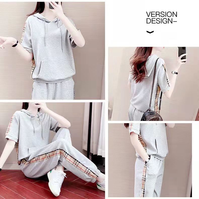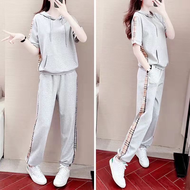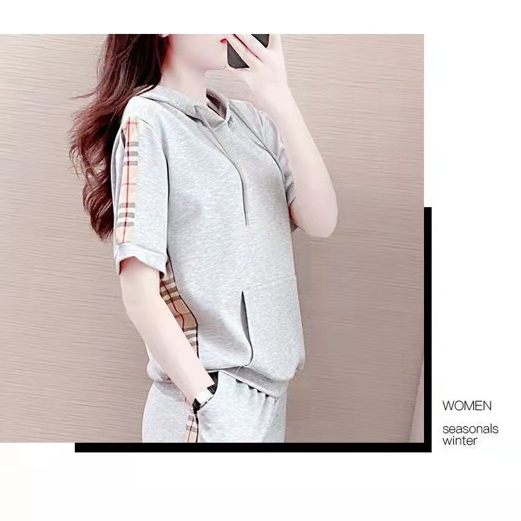 2022新款时尚宽松短袖连帽卫衣运动套装女夏季洋气减龄休闲两件套