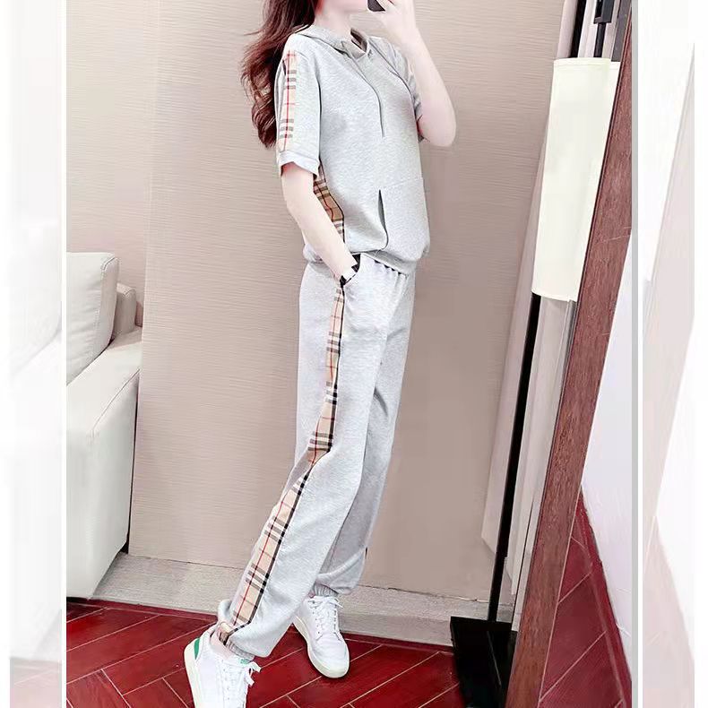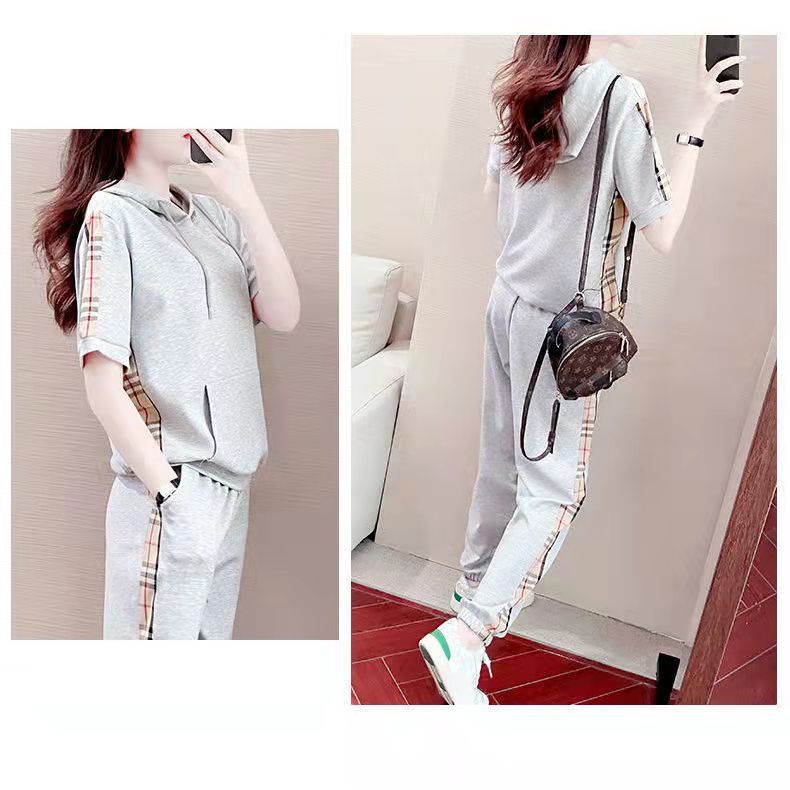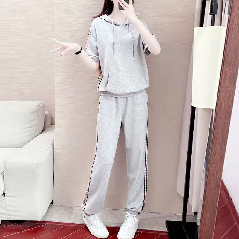 캐주얼 세트 여성 여름 새로운 한국 스타일 패션 스포츠웨어 느슨한 플러스 사이즈 회색 반소매 후드 투피스 세트