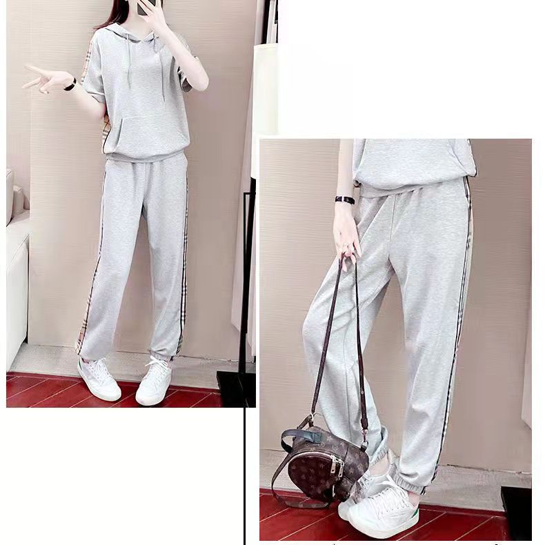 캐주얼 세트 여성 여름 새로운 한국 스타일 패션 스포츠웨어 느슨한 플러스 사이즈 회색 반소매 후드 투피스 세트스토어 가기