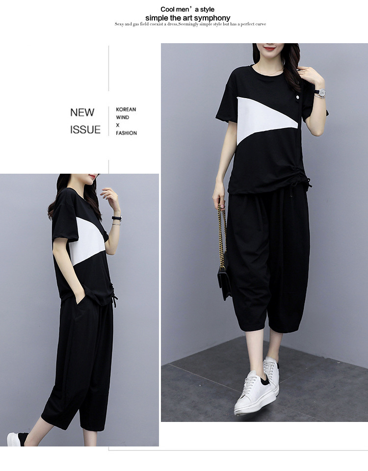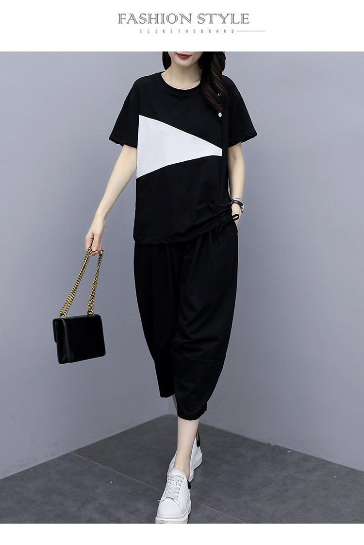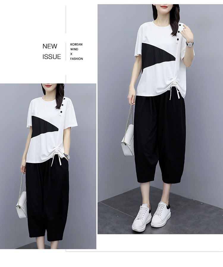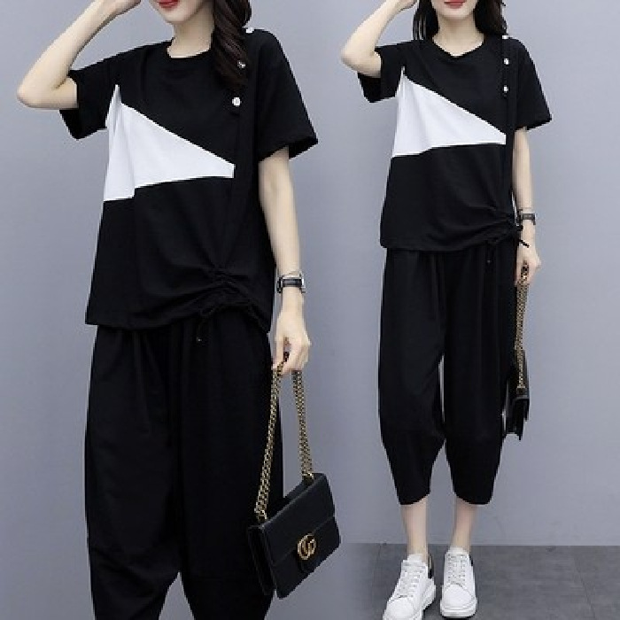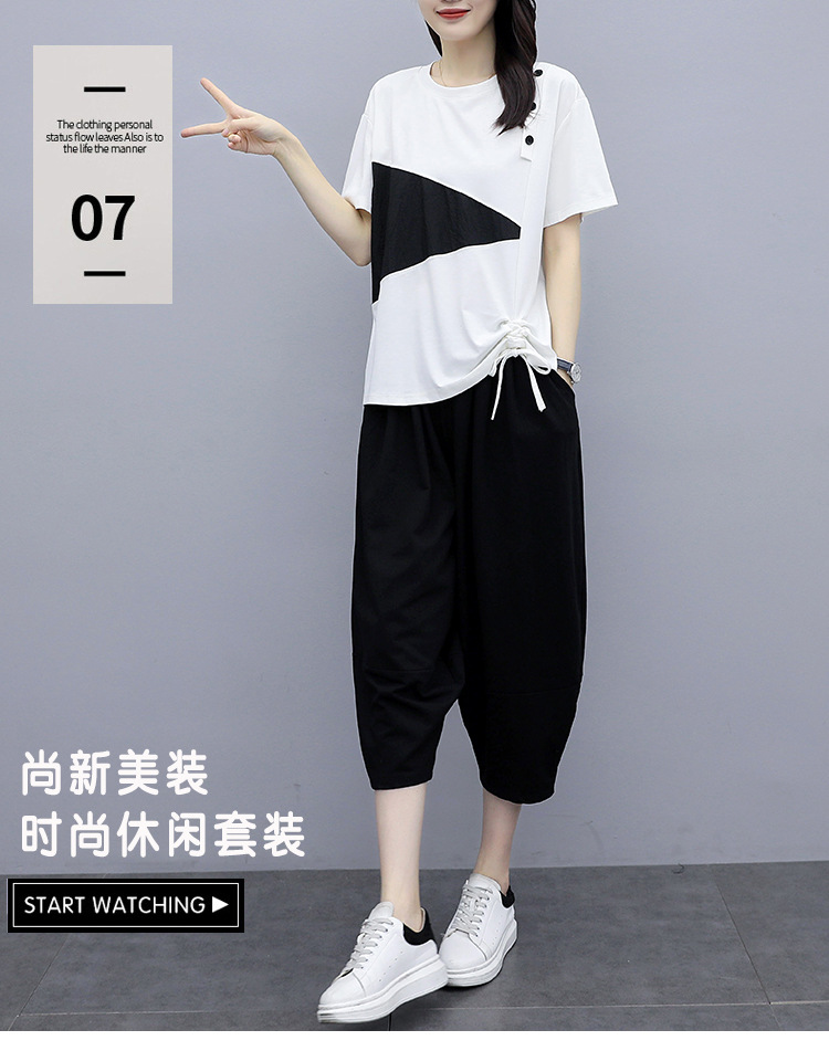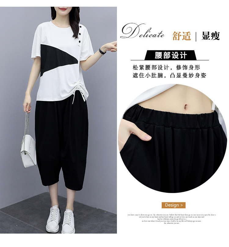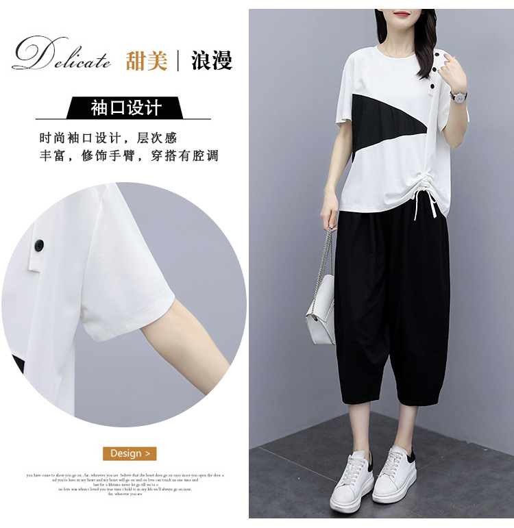 플러스 사이즈 여성의 세련된 연령 감소 컬러 블록 반팔 세트 여름 새로운 통통녀 느슨한 슬리밍 카프리 팬츠 투피스 세트