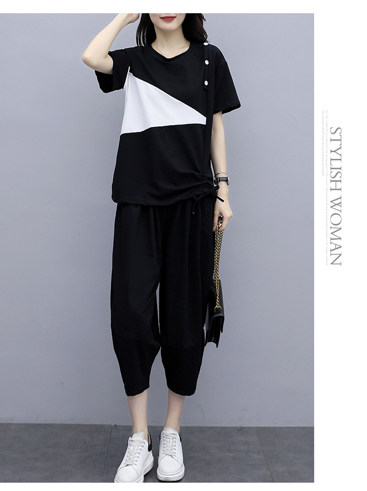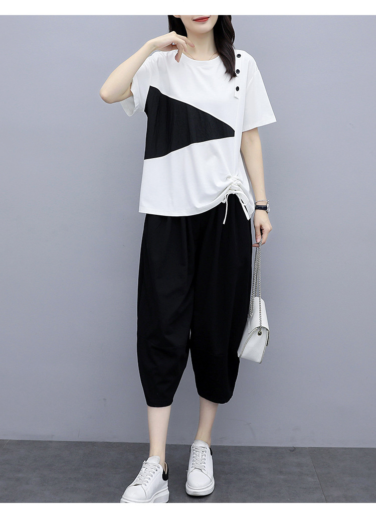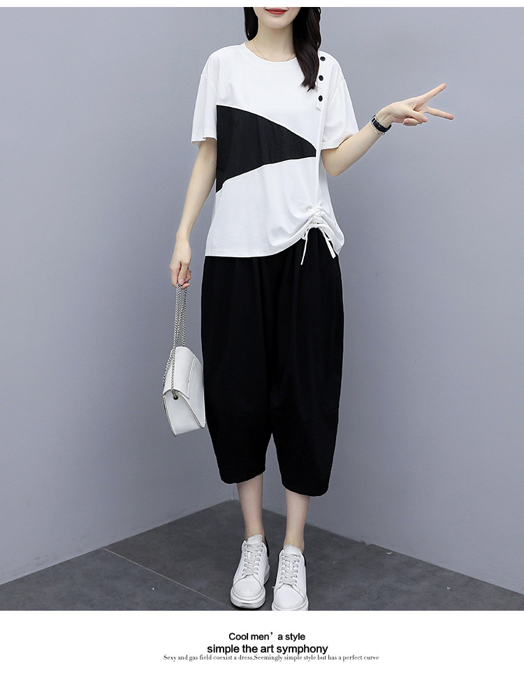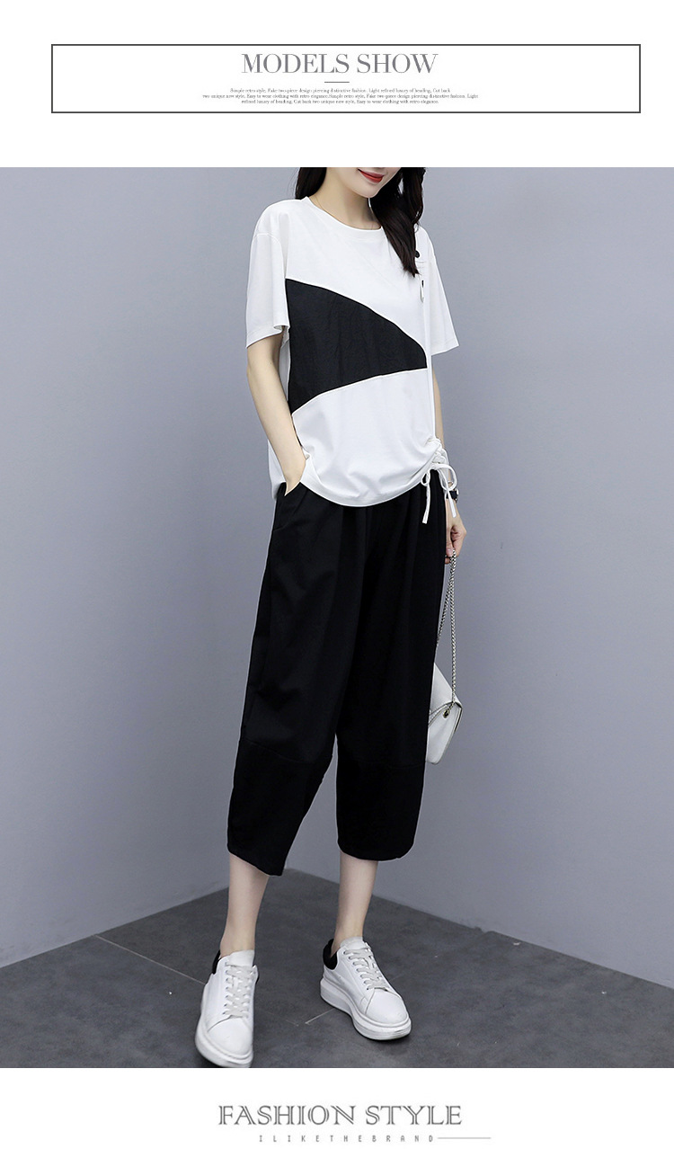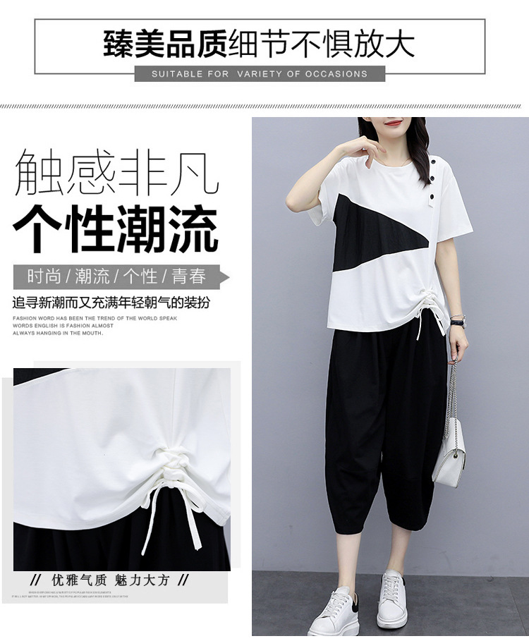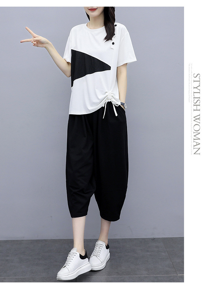 플러스 사이즈 여성의 세련된 연령 감소 컬러 블록 반팔 세트 여름 새로운 통통녀 느슨한 슬리밍 카프리 팬츠 투피스 세트