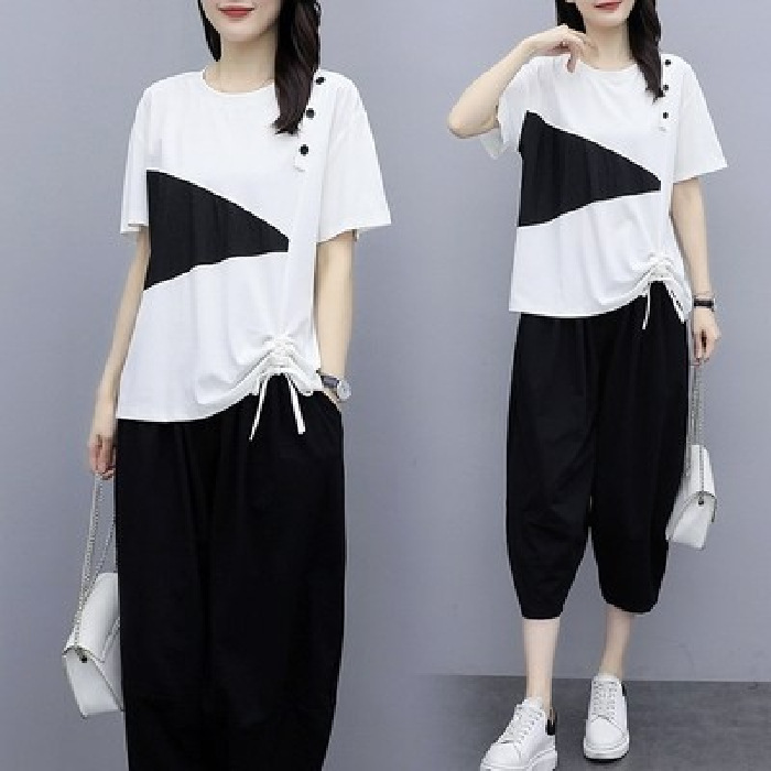 플러스 사이즈 여성의 세련된 연령 감소 컬러 블록 반팔 세트 여름 새로운 통통녀 느슨한 슬리밍 카프리 팬츠 투피스 세트스토어 가기