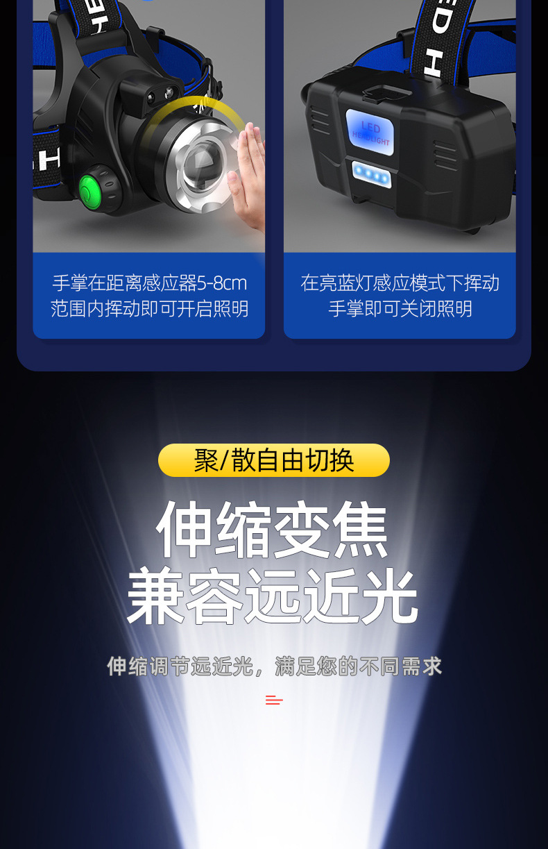 국경 간 도매 T6 텔레스코픽 줌 USB 충전 야외 긴 내구성 낚시 및 캠핑 헤드 장착형 LED 밝은 헤드 라이트스토어 가기