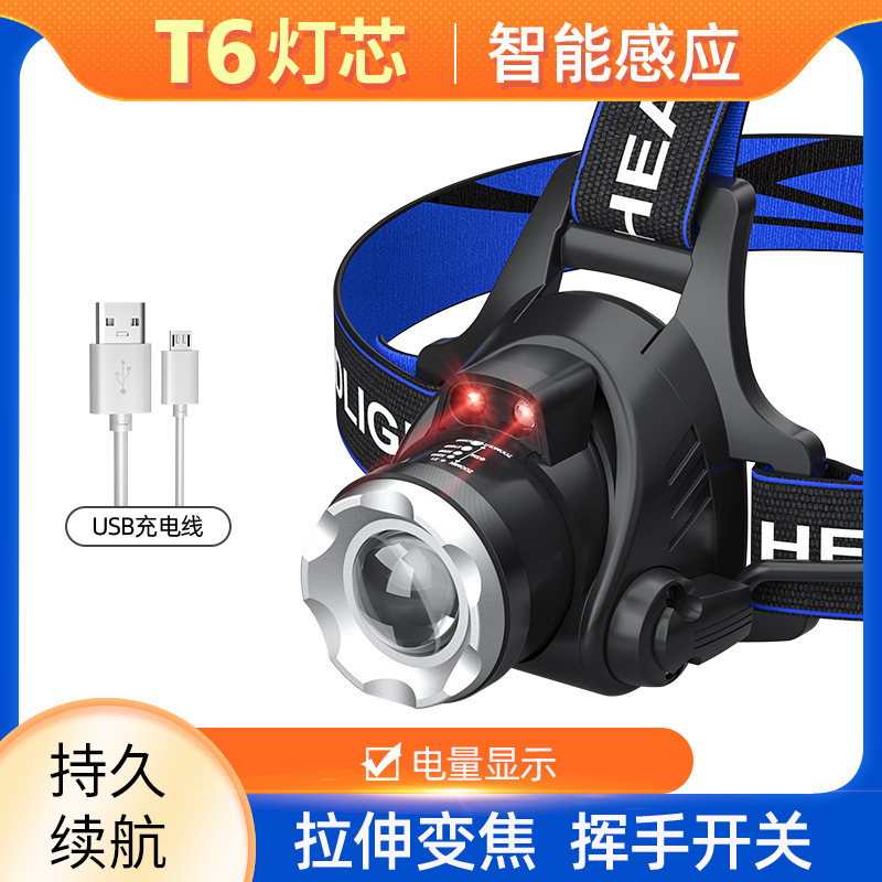 국경 간 도매 T6 텔레스코픽 줌 USB 충전 야외 긴 내구성 낚시 및 캠핑 헤드 장착형 LED 밝은 헤드 라이트