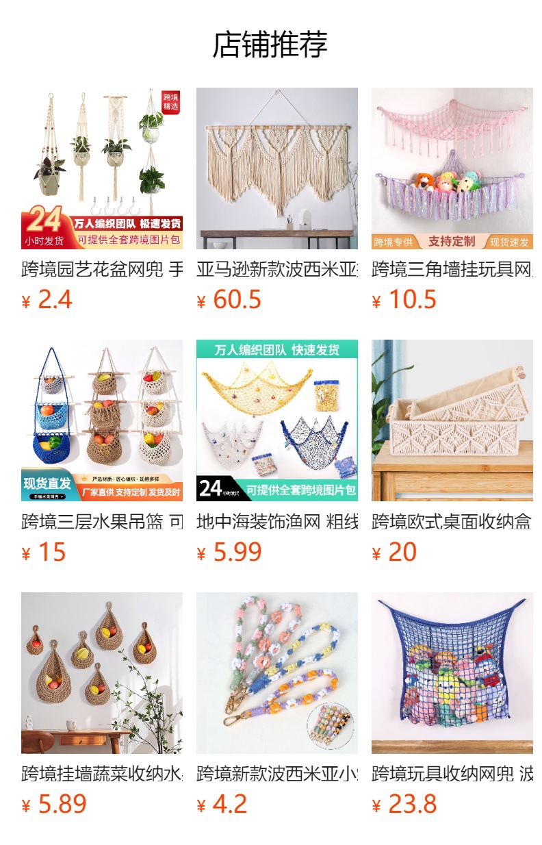 注意事项:渔网网孔尺寸约为5cm左右,棉绳直径2MM左右,现货一共有三个尺寸,需要其他尺寸和颜色定制可以联系客服。棉绳具有弹性编织,所以在尺寸上难免会有偏差。平铺尺寸偏小,比如规格里1*2尺寸就是宽1米,绳子拉直长2米。