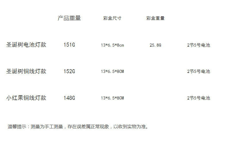电源规格:10灯2AA电池盒    20灯(含以上都是3AA电池盒(需另配5号电池)