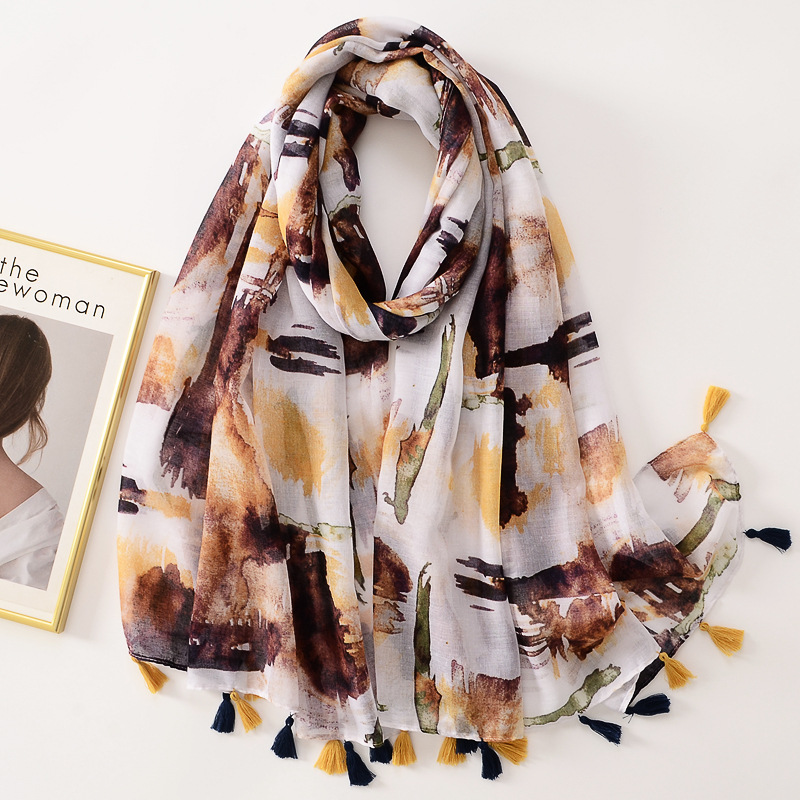 우아한 부드러운 실크 원사면과 린넨 느낌 스카프 잉크 페인팅 긴 술 대형 스카프 여행 선 스크린 비치 타월