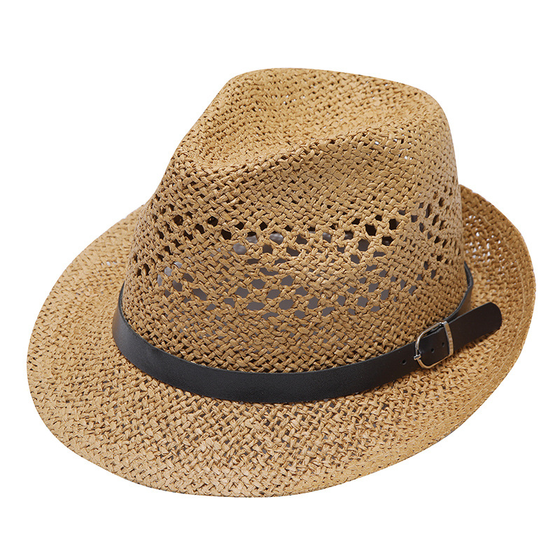 봄과 여름 새로운 수제 중공 종이 잔디 재즈 모자 여성용 작은 챙 차양 자외선 차단제 탑 모자 남성용 가죽 버클 장식 태양 모자스토어 가기