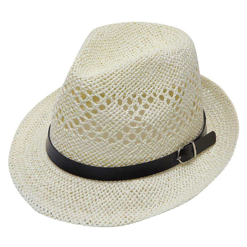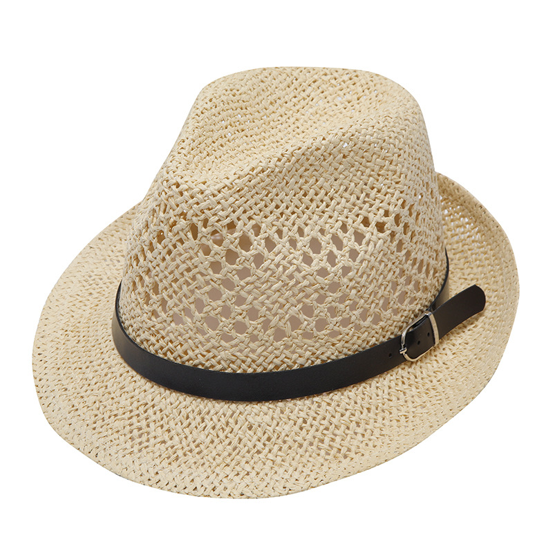 봄과 여름 새로운 수제 중공 종이 잔디 재즈 모자 여성용 작은 챙 차양 자외선 차단제 탑 모자 남성용 가죽 버클 장식 태양 모자