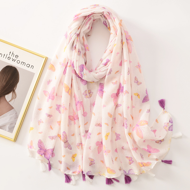 신선한 달콤한 우아한 예술적 긴 술 스카프 핑크 나비 골드 핑크 장식 스카프 여행 자외선 차단제 목도리