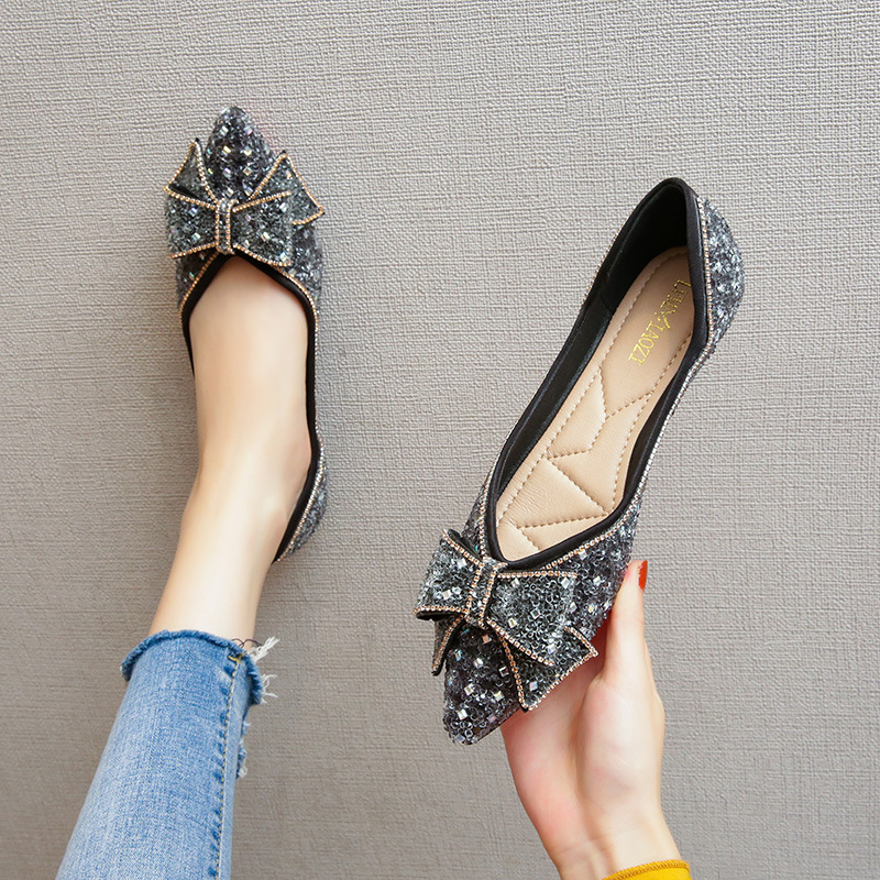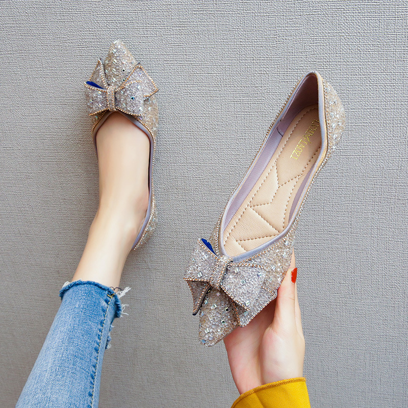 여성용 여름 플랫 슈즈, 2025년 신상, 리본과 큐빅 장식, 얕은 굽, 큰 사이즈(41~43)스토어 가기