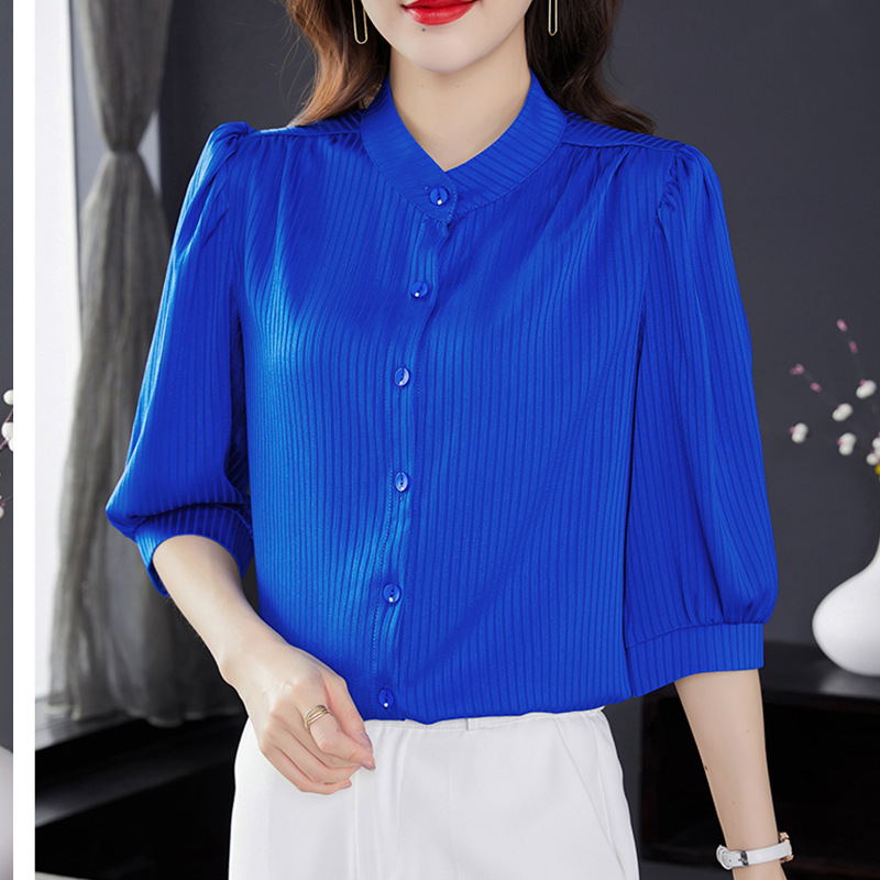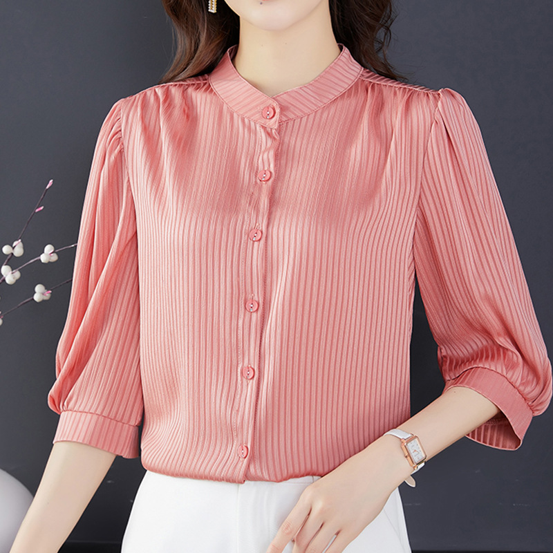 모조 실크 셔츠 여성용 반팔 스트라이프 셔츠 2022 봄과 여름 새로운 7 소매 탑 하이 엔드 웨스턴 스타일