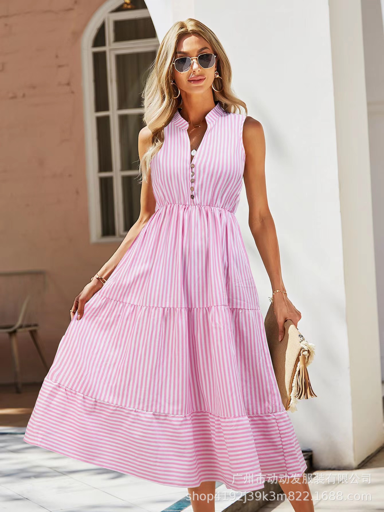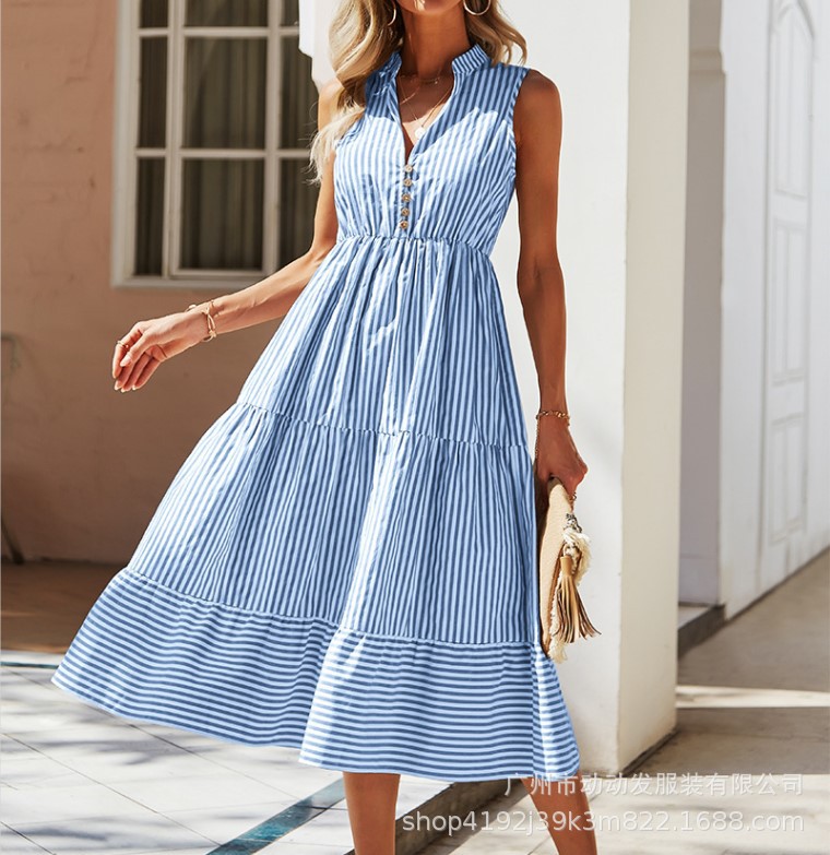 AliExpress 해외 무역 2022 유럽과 미국 여름 새로운 스트라이프 V-넥 민소매 탄성 허리 큰 원피스 여성