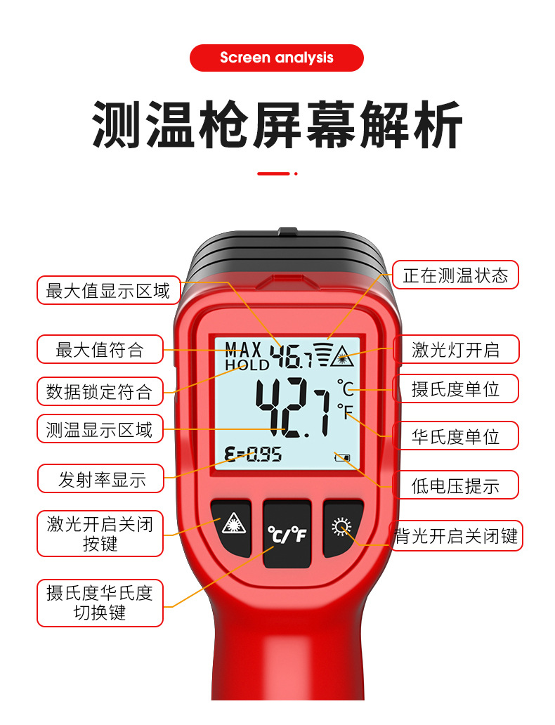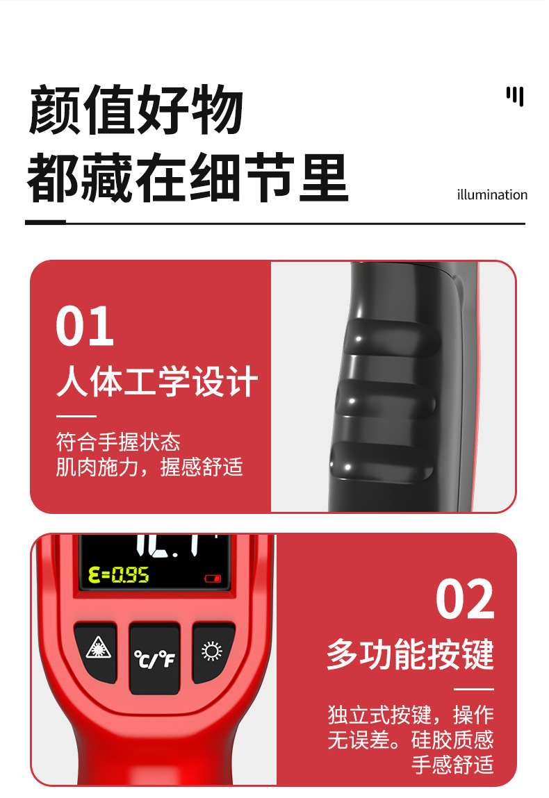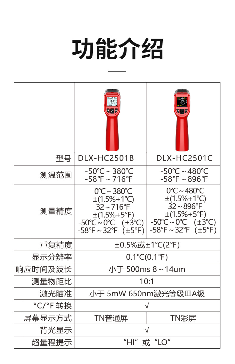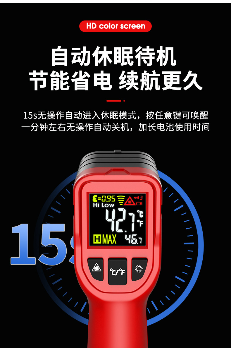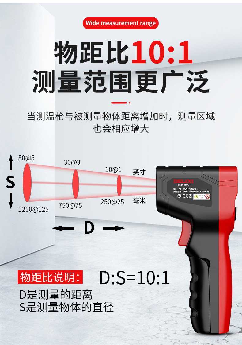 7. 可远距离测量:通过激光瞄准,物距比10:1,能够在一定距离外准确测量目标物体的温度。