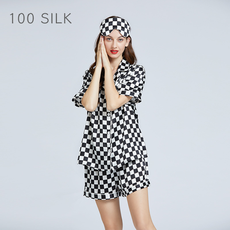 Cocoonie 새로운 프랑스 격자 무늬 잠옷 여자의 세트 19 mm 무거운 실크 잠옷 캐주얼 통기성 옷