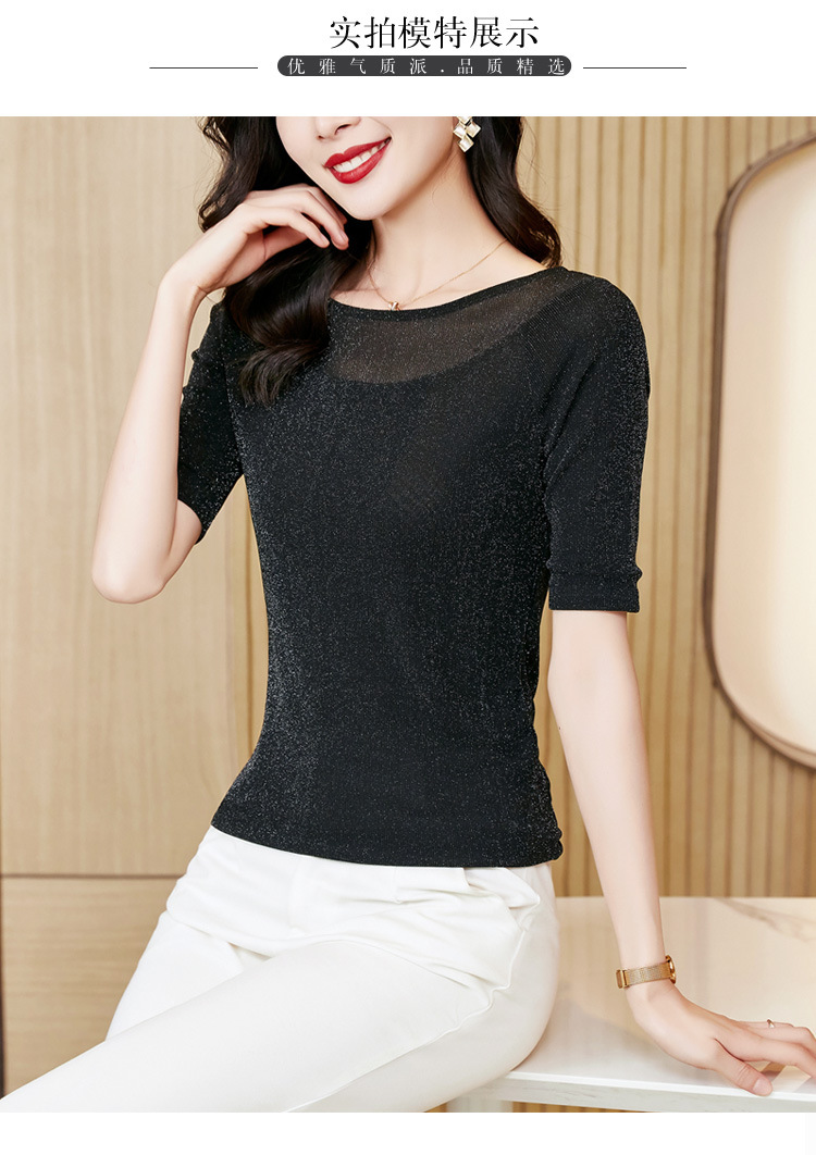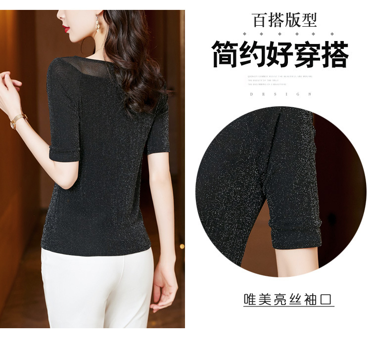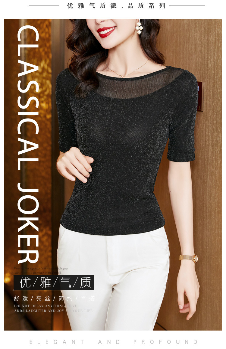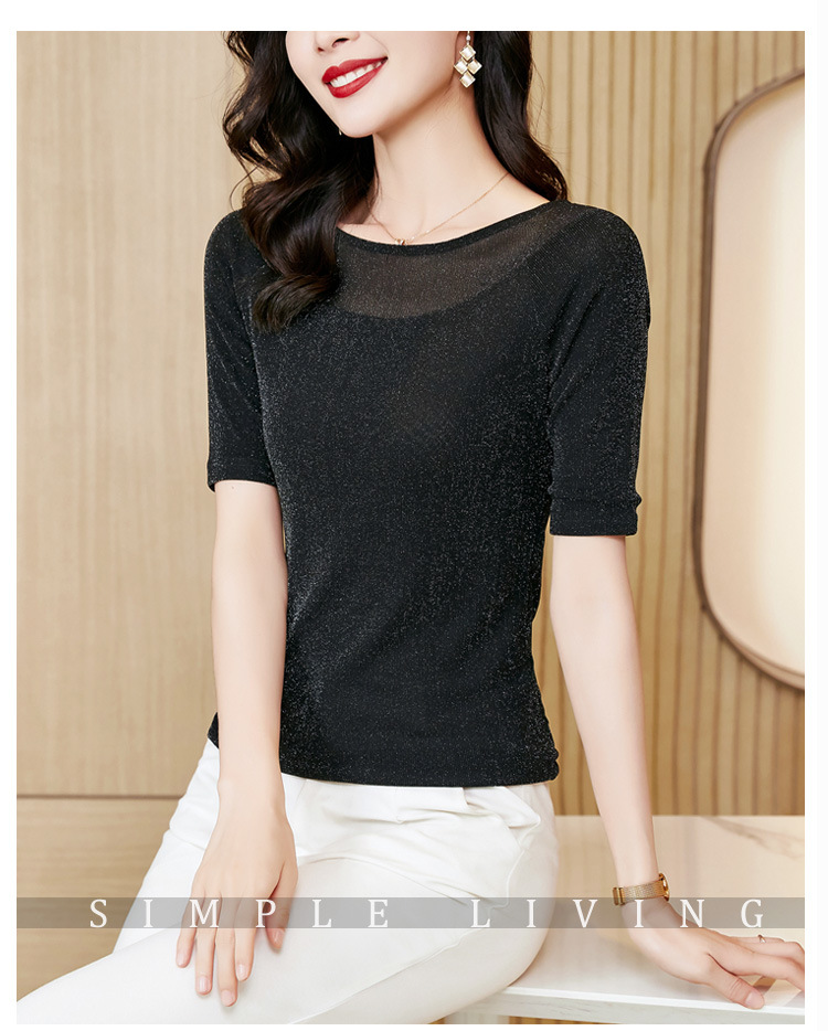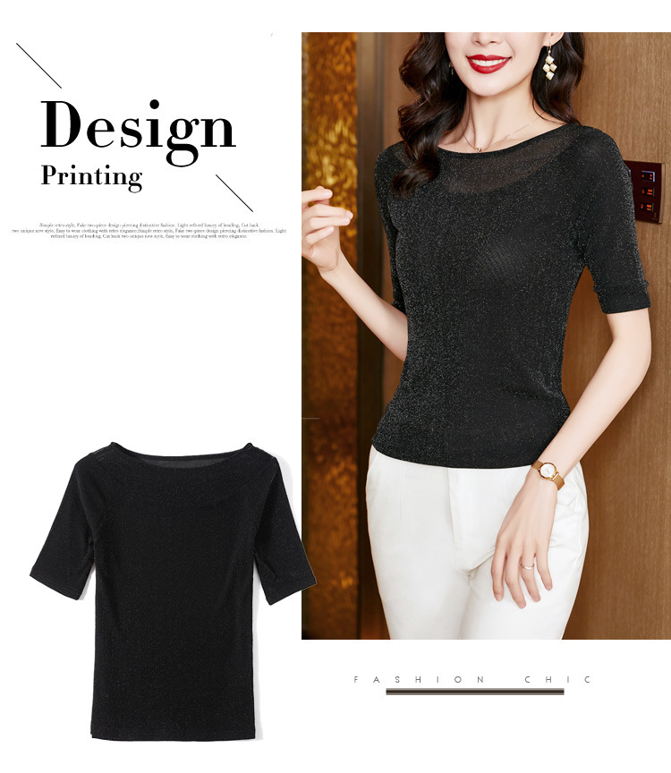 2022 새로운 여름 클래식 다목적 블랙 원 라인 칼라 미드 슬리브 밝은 실크 메쉬 바닥 셔츠 슬림 슬림 티셔츠 여성용