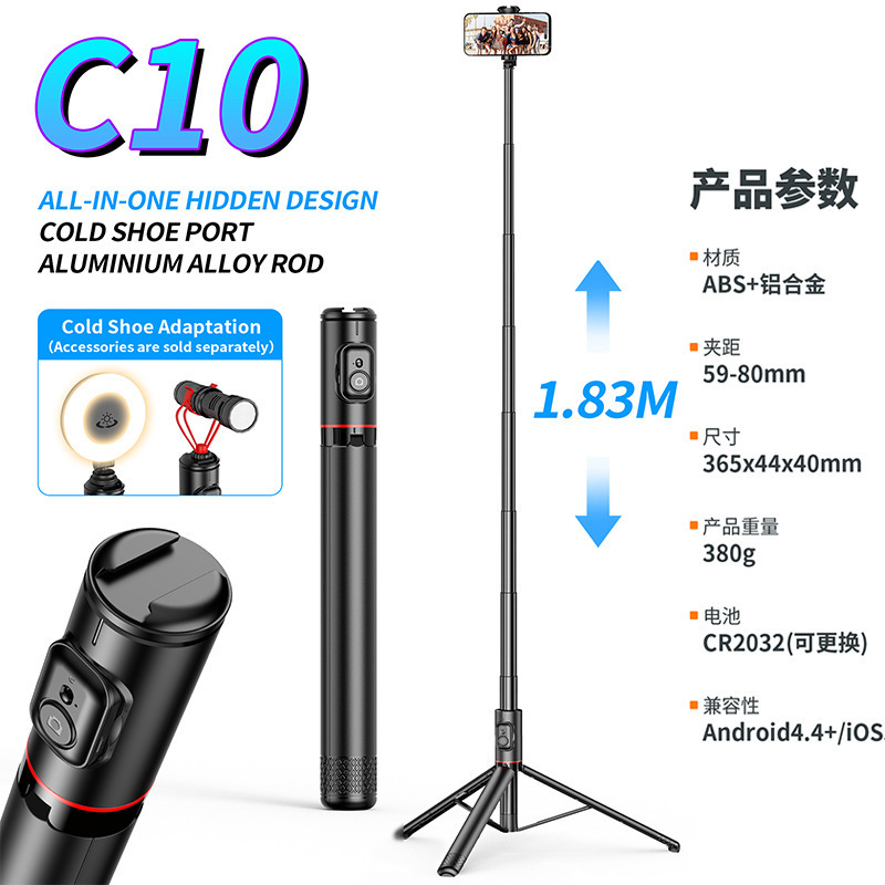 1.便携一体隐藏式设计; 2.雨伞式结构加固三脚架; 3.新款蓝牙自拍遥控器; 4.耐用铝合金杆 5.支持横竖拍 6.Android、iOS都兼容。