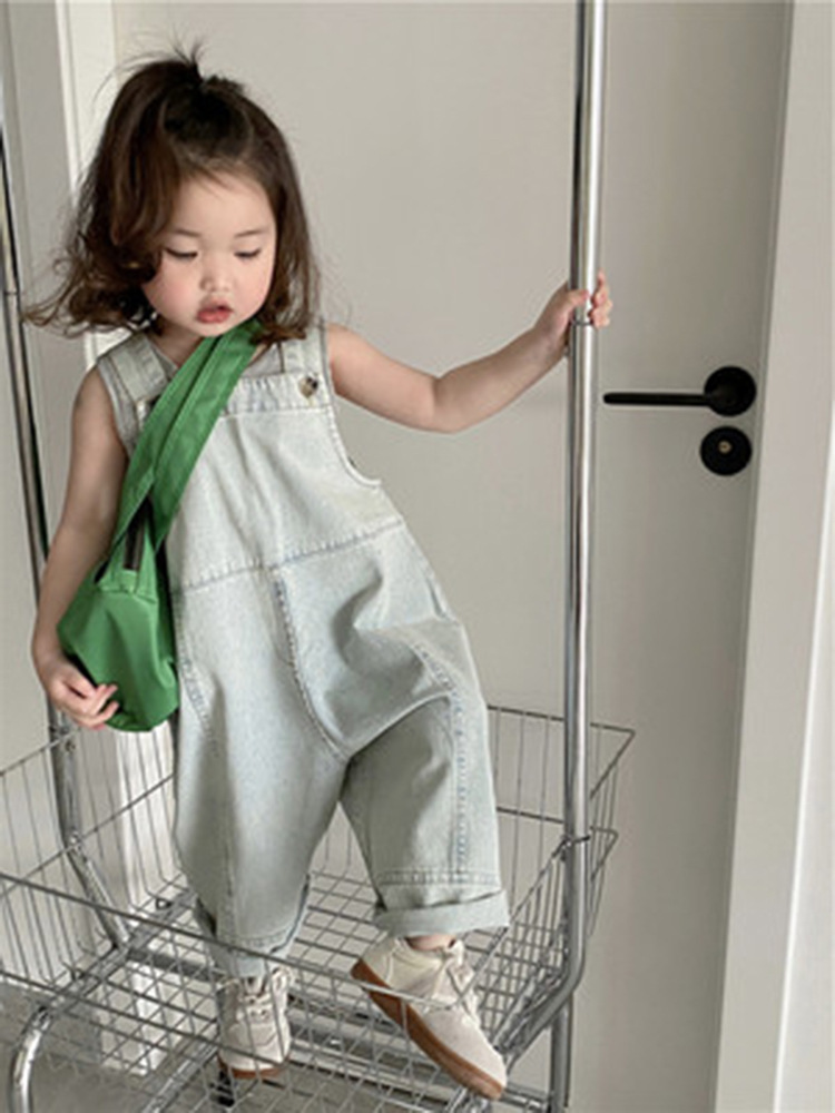 남자와 여자 데님 멜빵 여름 어린이 느슨한 점프 슈트 어린이 바지 3-8 세 어린이 의류 머리카락의 세대