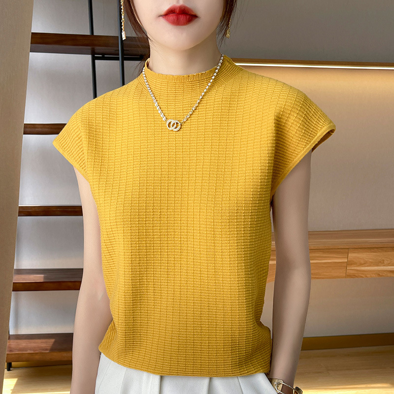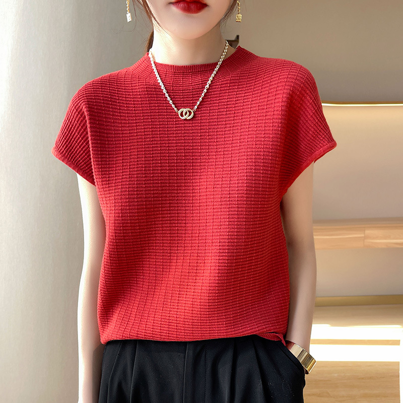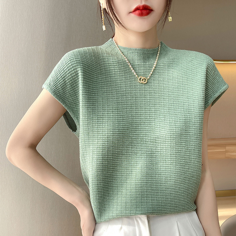 얇은 반팔 니트웨어 반하이넥 니트 봄 여름 신상 다용도 통근용 통기성 체크무늬 탑 슬림핏