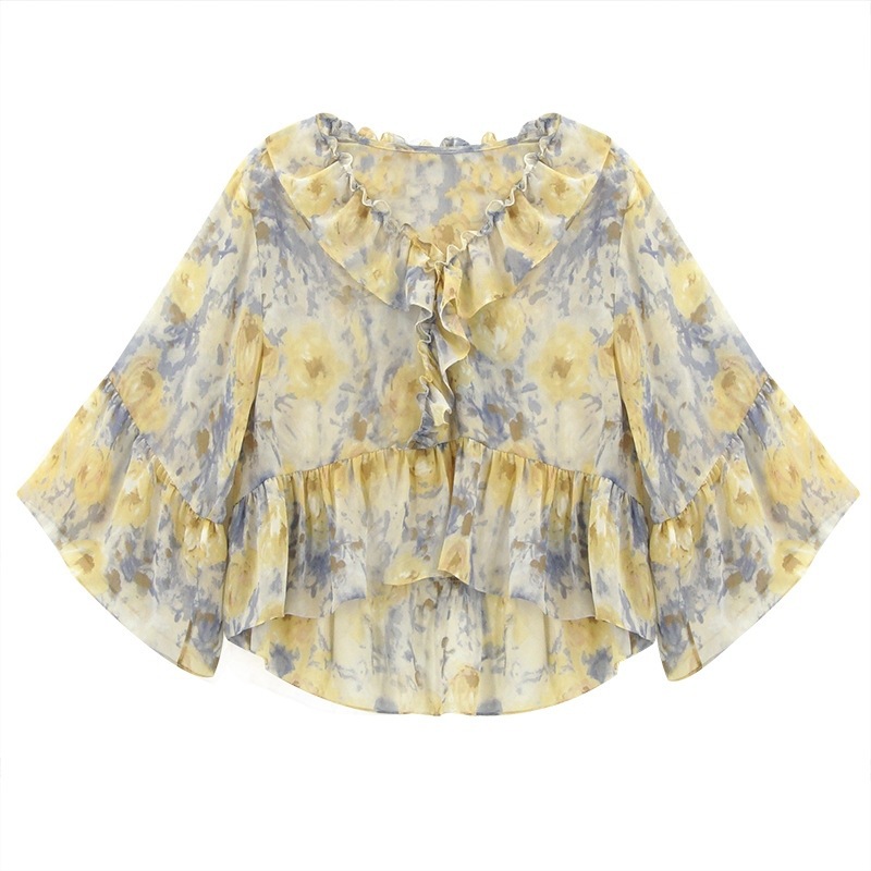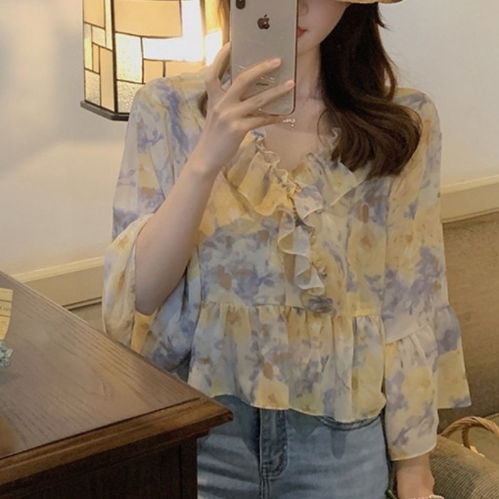 러플 장식의 달콤한 쉬폰 셔츠 여성용 2025 여름 신상 프렌치 스타일 중간 소매 꽃무늬 상의스토어 가기