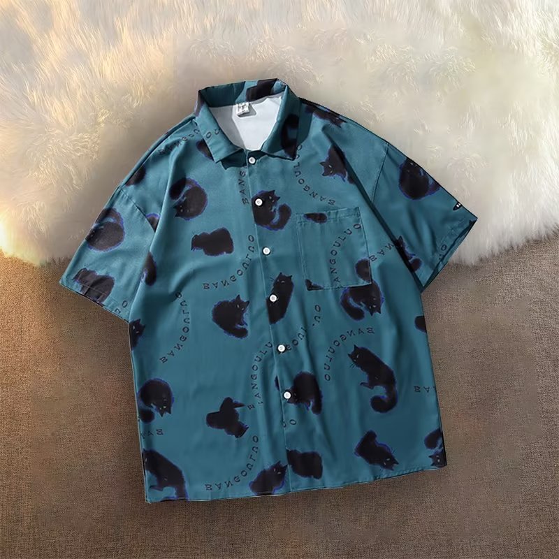 여름 새로운 고양이 전체 인쇄 짧은 소매 셔츠 남자의 힙합 유행 느슨한 캐주얼 재킷 복고풍 셔츠 커플 탑스토어 가기