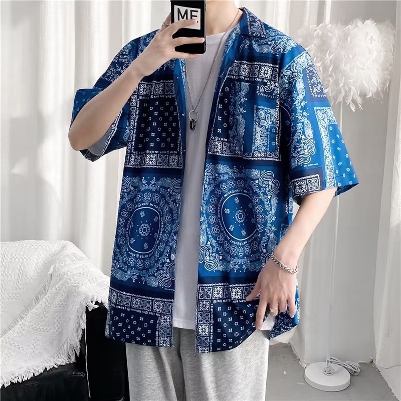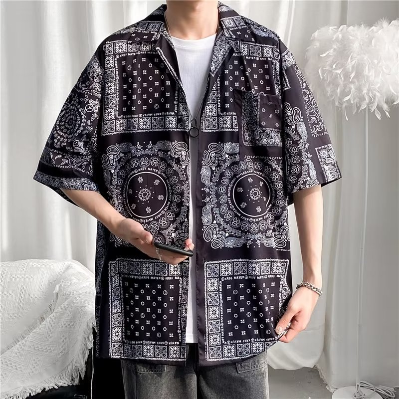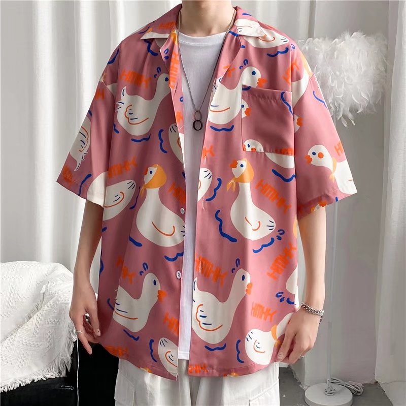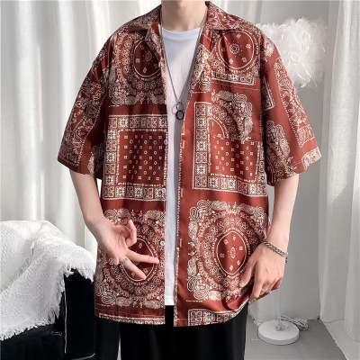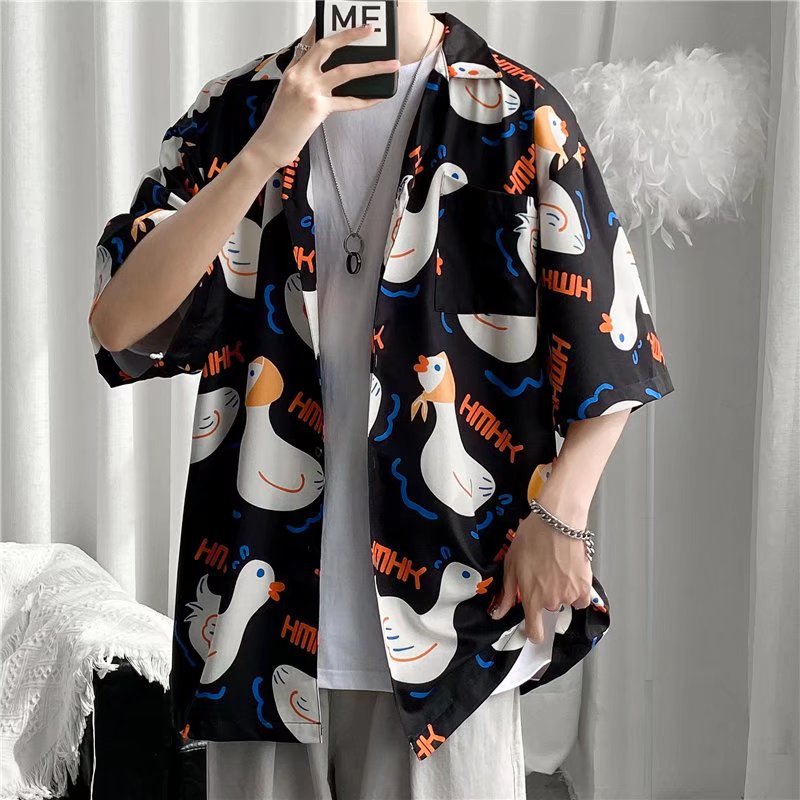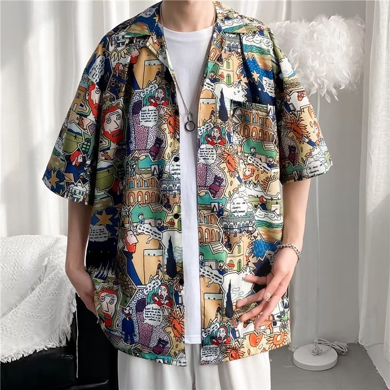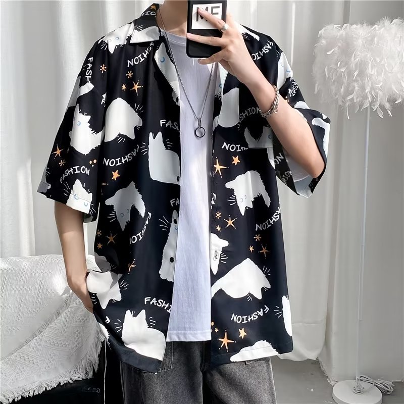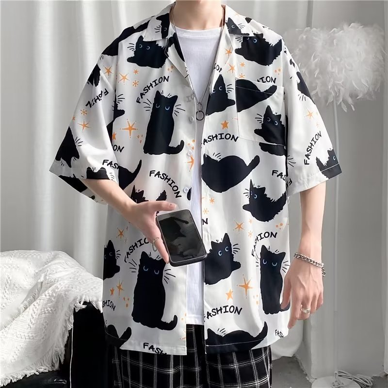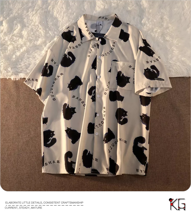 여름 새로운 고양이 전체 인쇄 짧은 소매 셔츠 남자의 힙합 유행 느슨한 캐주얼 재킷 복고풍 셔츠 커플 탑