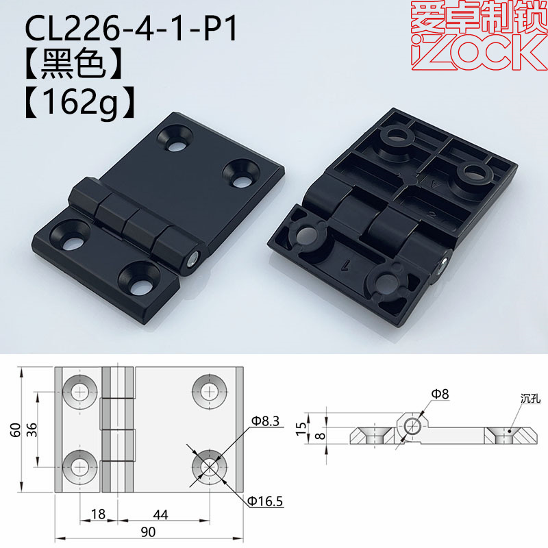 结构功能:明铰链,左右开门通用,用沉头螺钉固定,有三种规格供选择