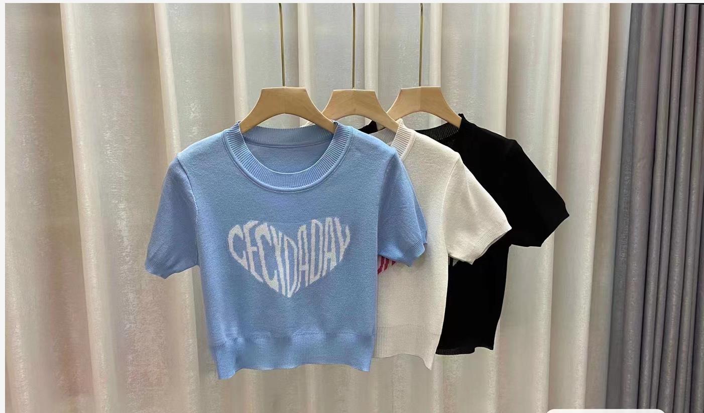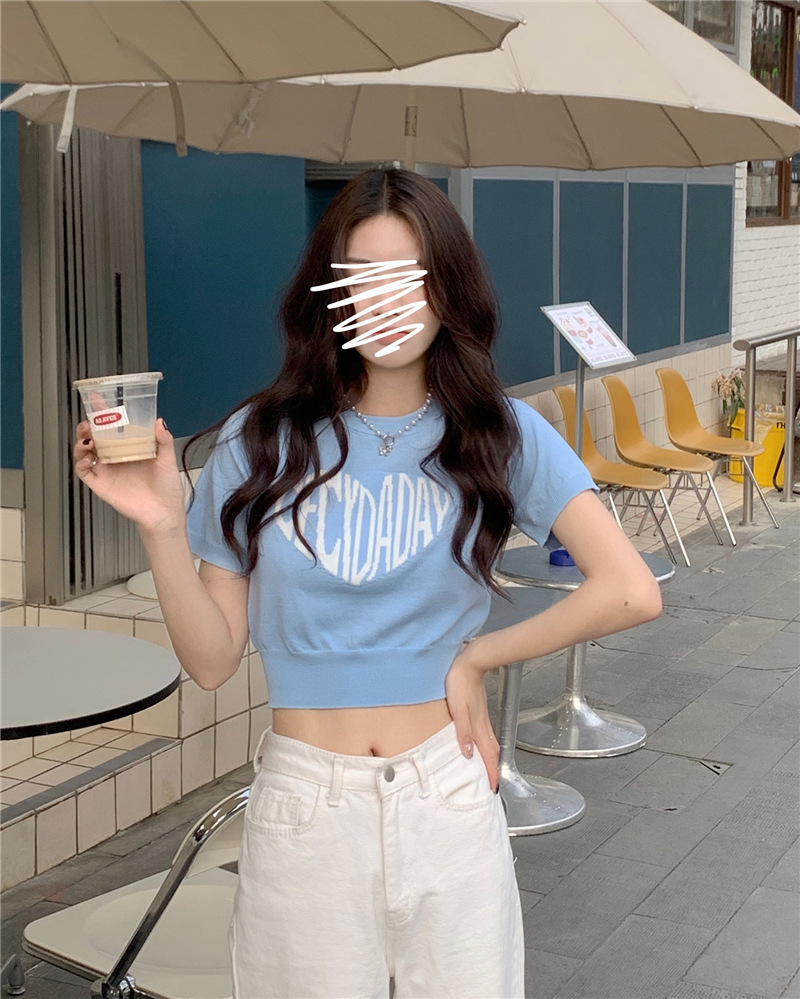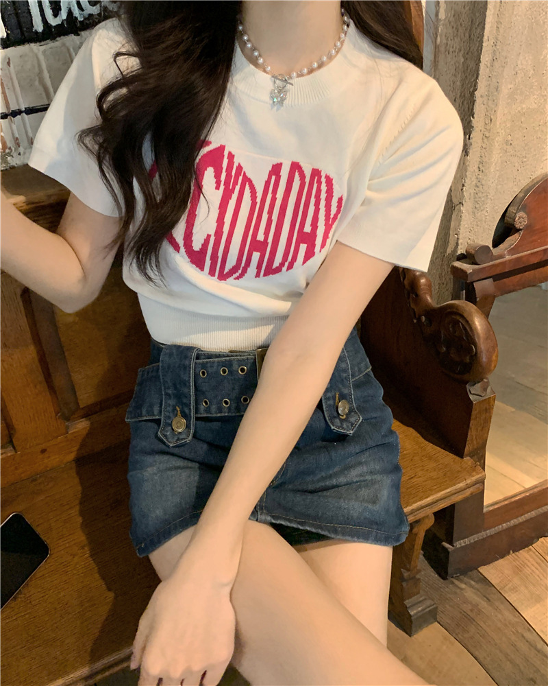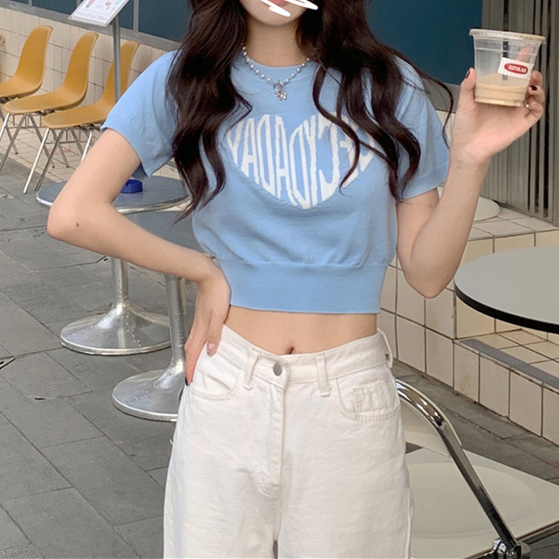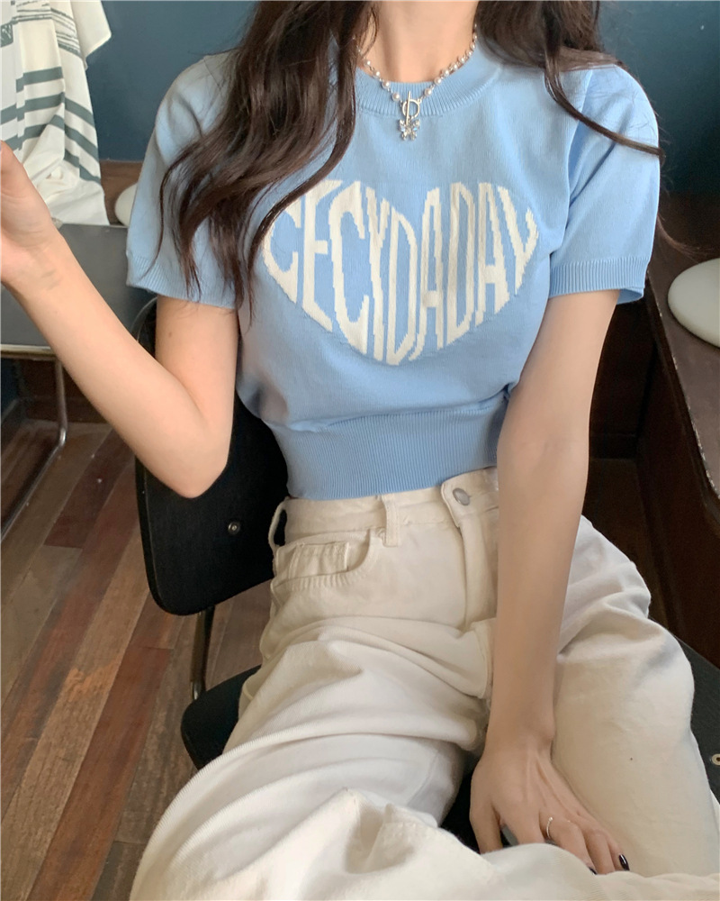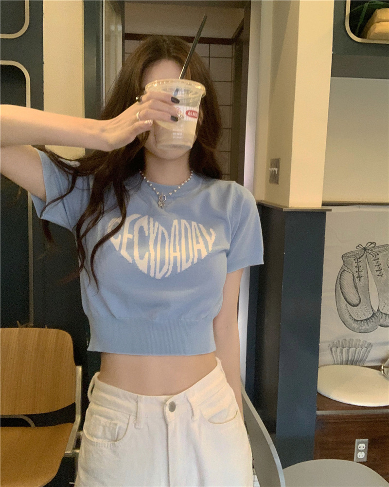 2025 여름 신상 트렌디 한국 스타일 달콤하고 매운 반팔 레터 프린트 슬림핏 라운드넥 숏 니트 여성복스토어 가기