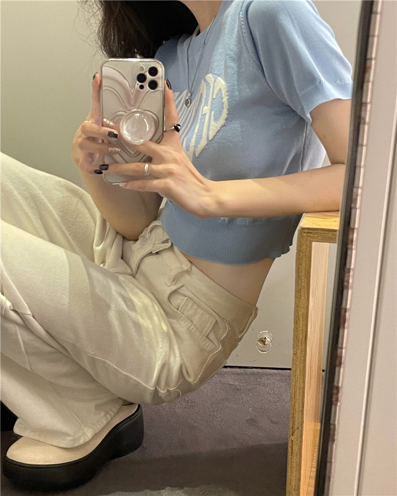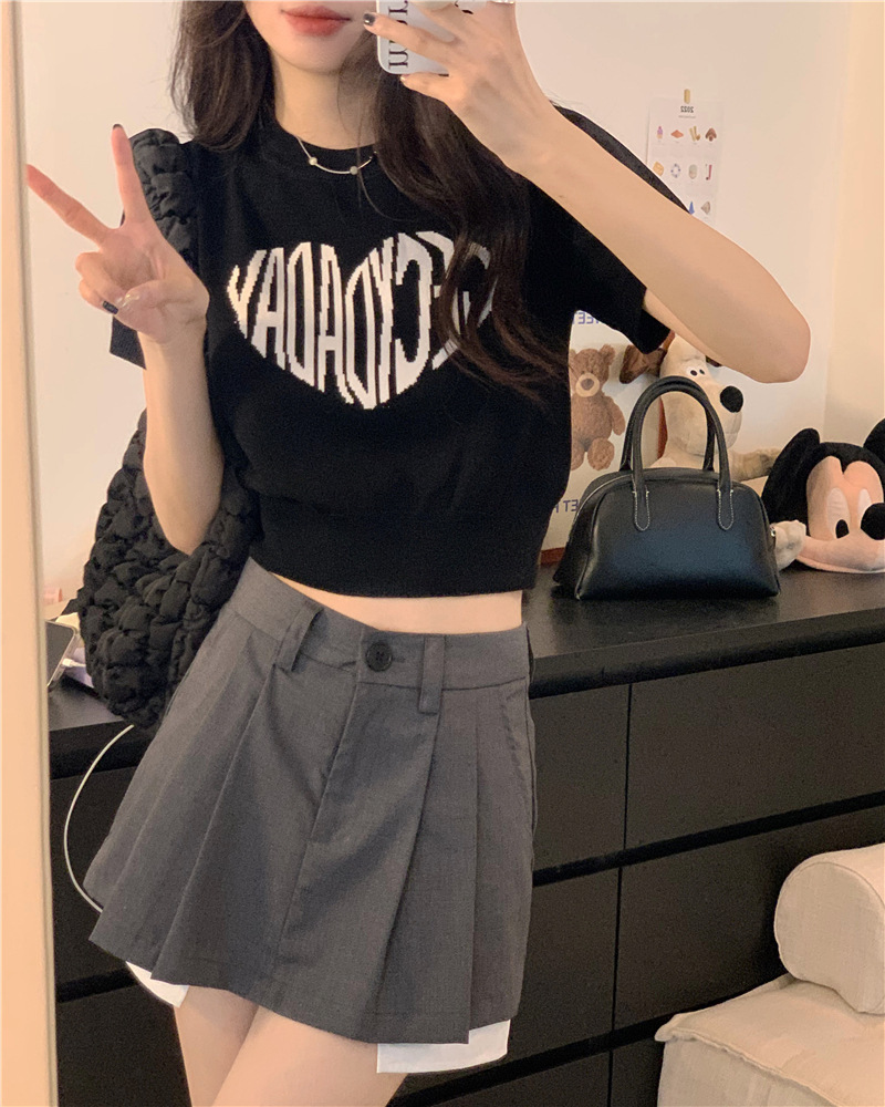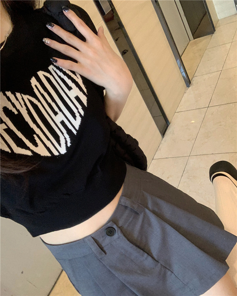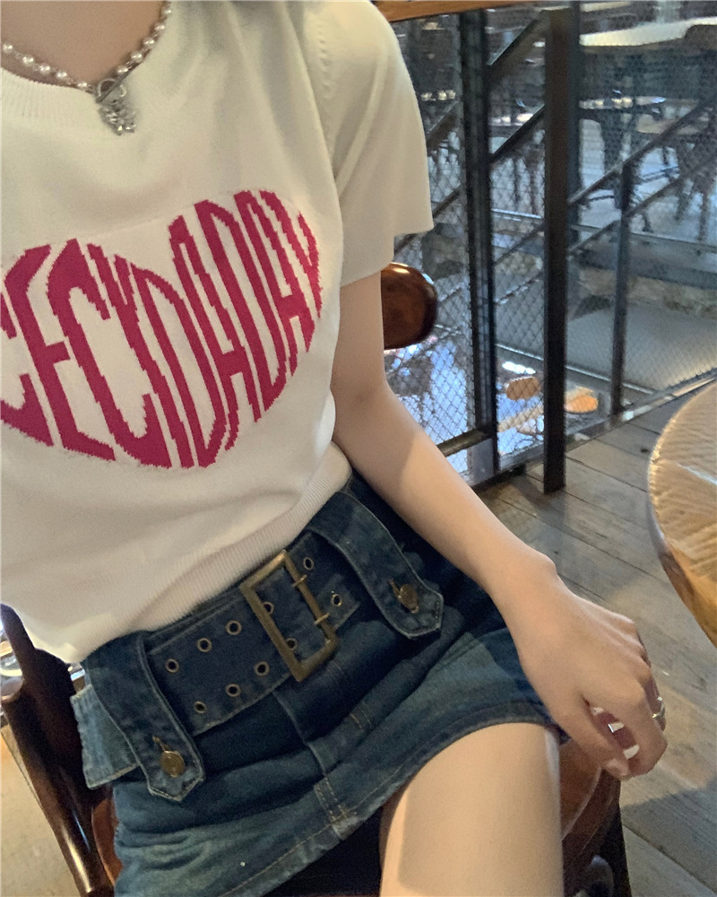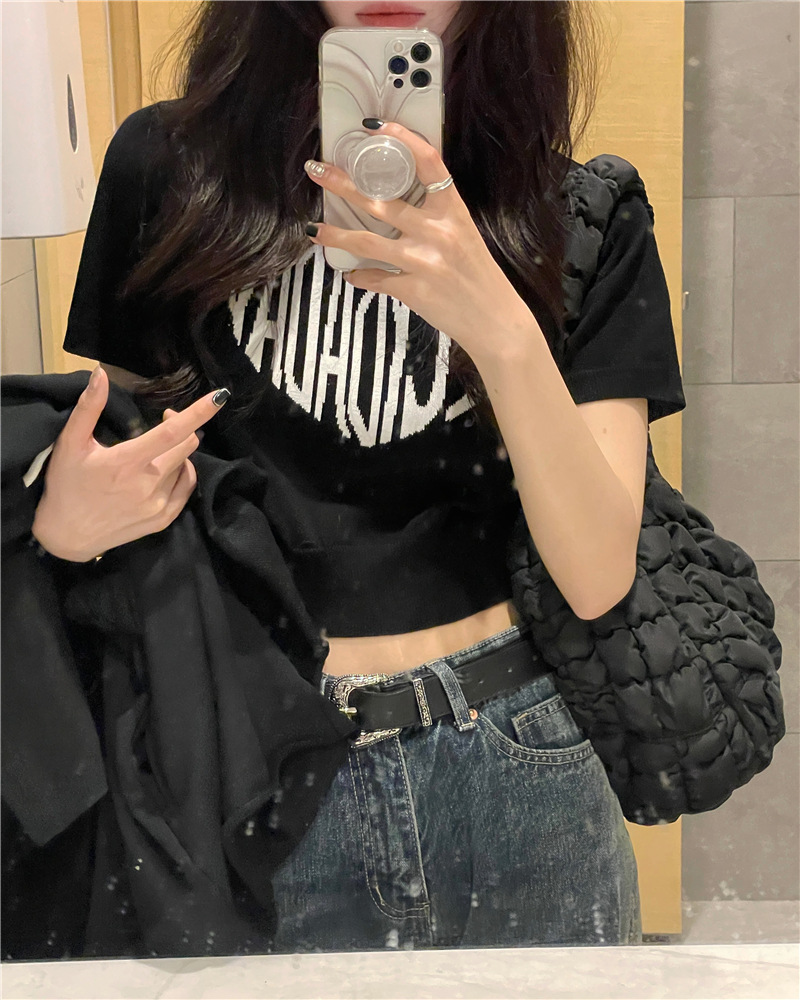 2025 여름 신상 트렌디 한국 스타일 달콤하고 매운 반팔 레터 프린트 슬림핏 라운드넥 숏 니트 여성복스토어 가기