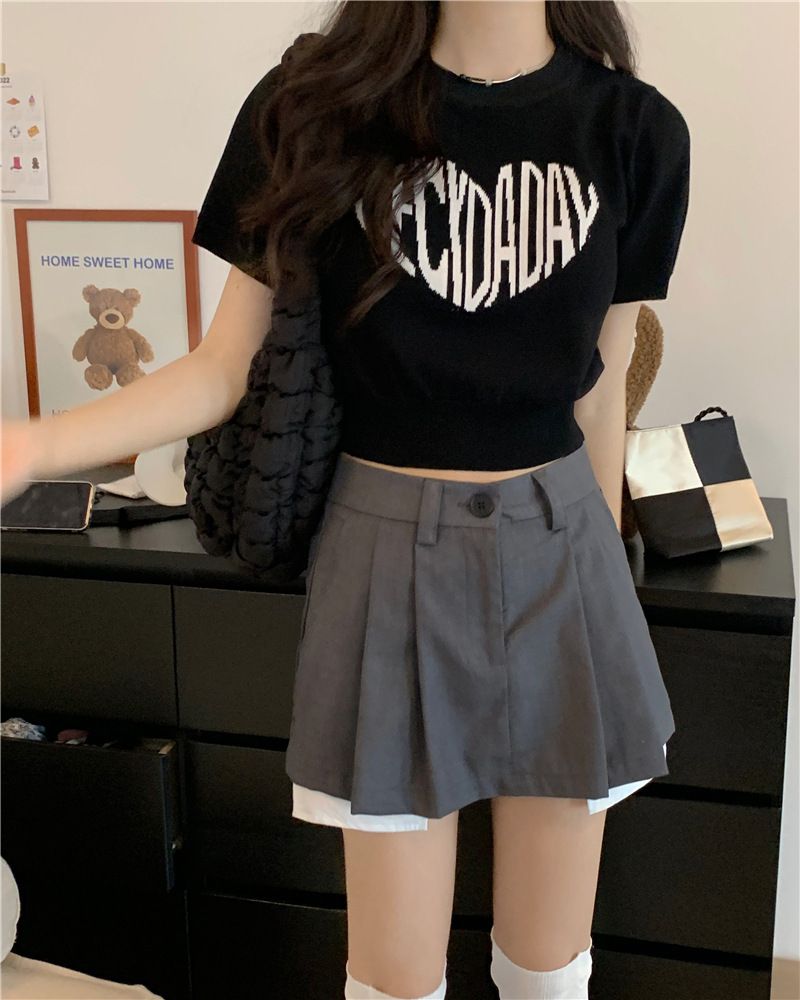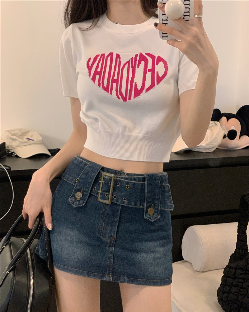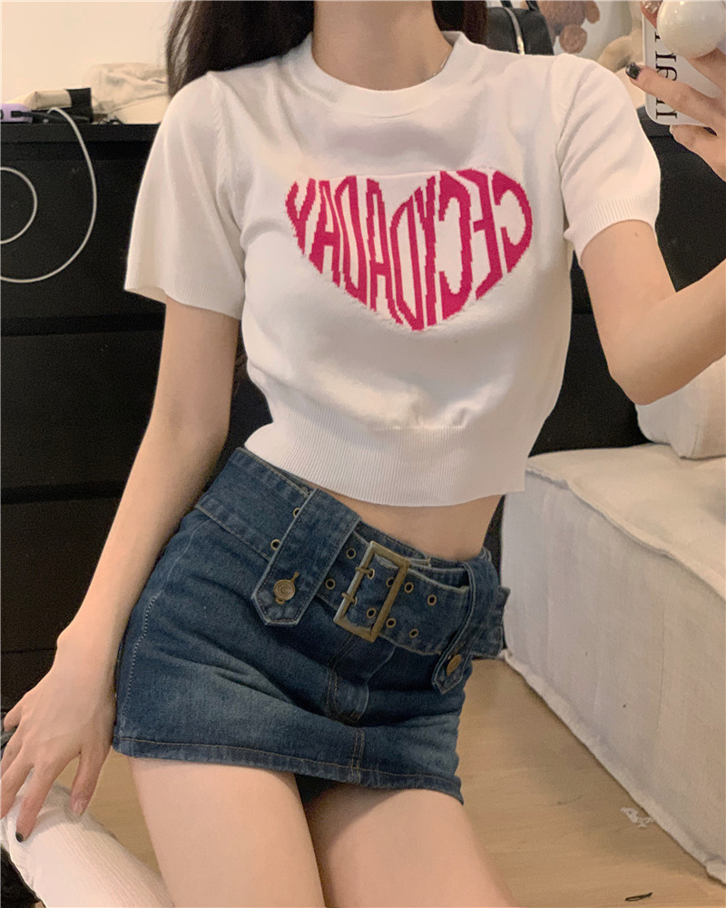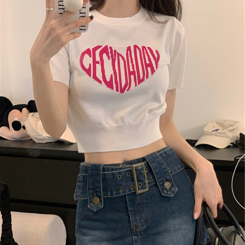2025 여름 신상 트렌디 한국 스타일 달콤하고 매운 반팔 레터 프린트 슬림핏 라운드넥 숏 니트 여성복