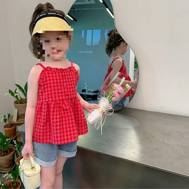 여아 홀터 탑 체크 무늬 등이없는 탑 홀터 스커트 23 여름 새로운 대외 무역 3-8 세 아동복스토어 가기