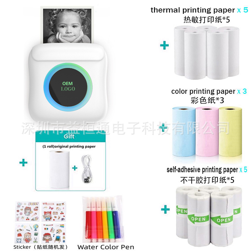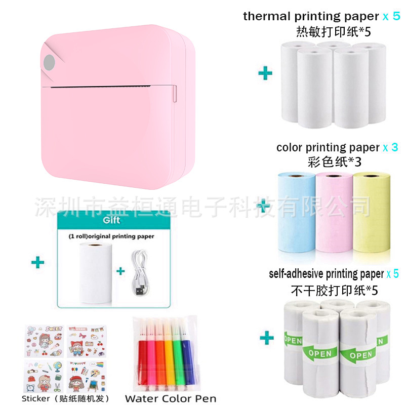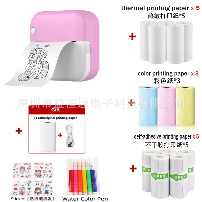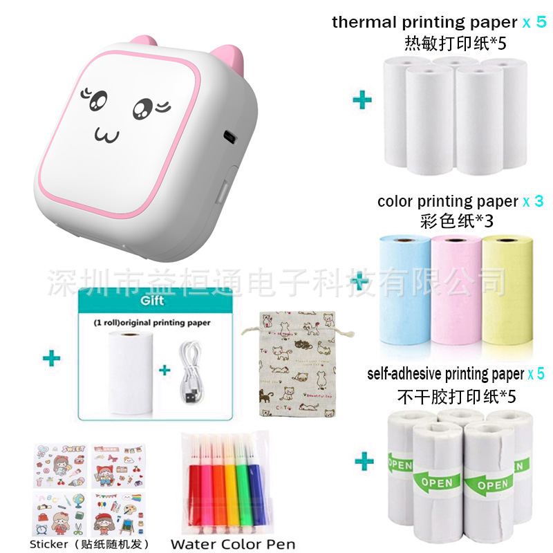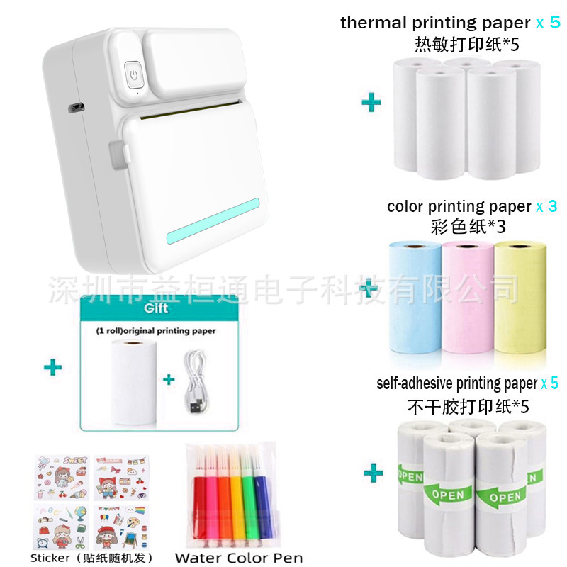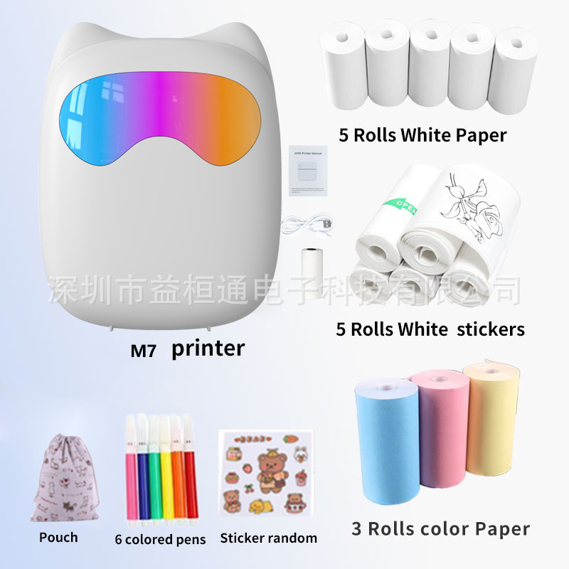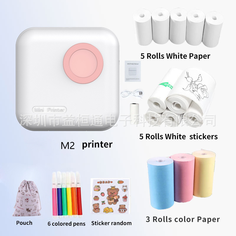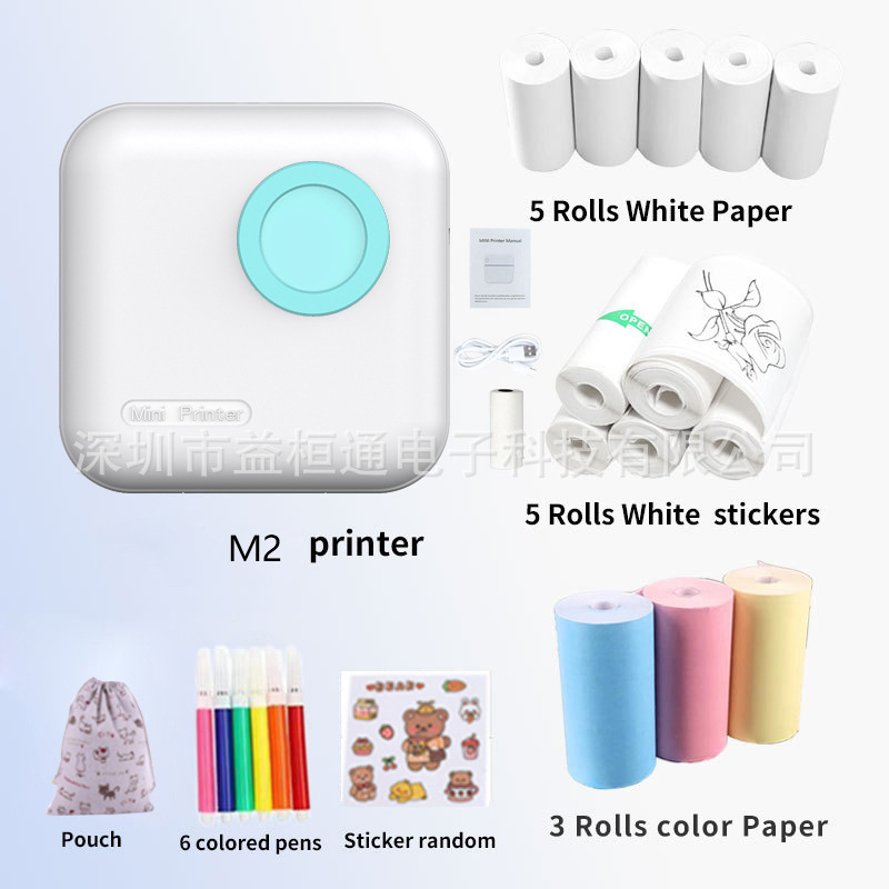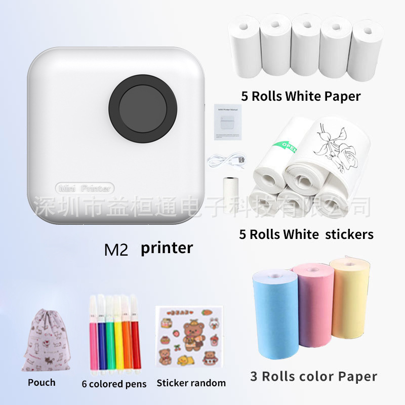 • M2 영어 흰색 및 검정색 + 감열지 5롤 + 자체 접착 롤 5개 + 색종이 3롤 + 수채화 펜 6개 + 만화 스티커 + 천 가방