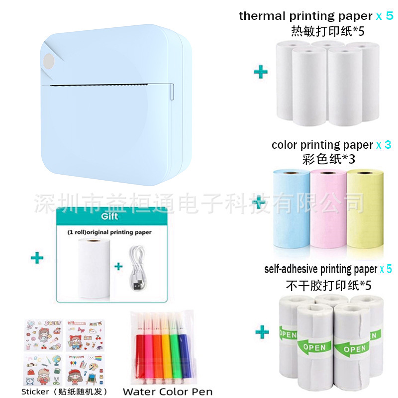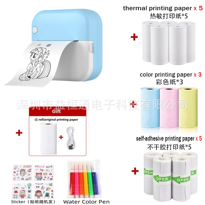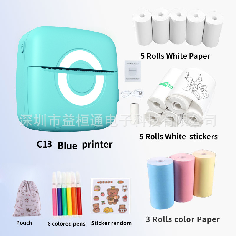 • C9 영어 흰색 파란색 + 감열지 5롤 + 자체 접착 롤 5개 + 색종이 3롤 + 수채화 펜 6개 + 만화 스티커