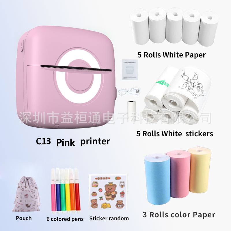 • C13 잉글리시 핑크 + 감열지 5롤 + 스티커 5롤 + 색종이 3롤 + 수채펜 6개 + 만화 스티커 + 천 가방