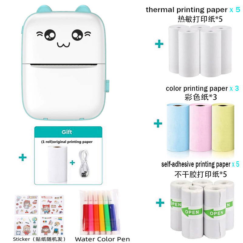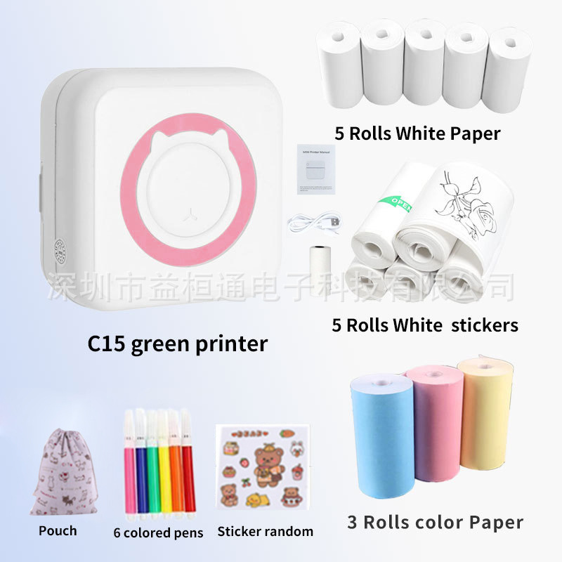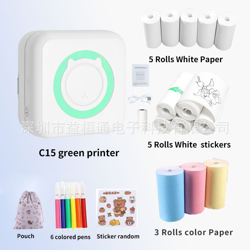 • C15 영어 흰색 및 녹색 + 감열지 5롤 + 자체 접착 롤 5개 + 색종이 3롤 + 수채화 펜 6개 + 만화 스티커