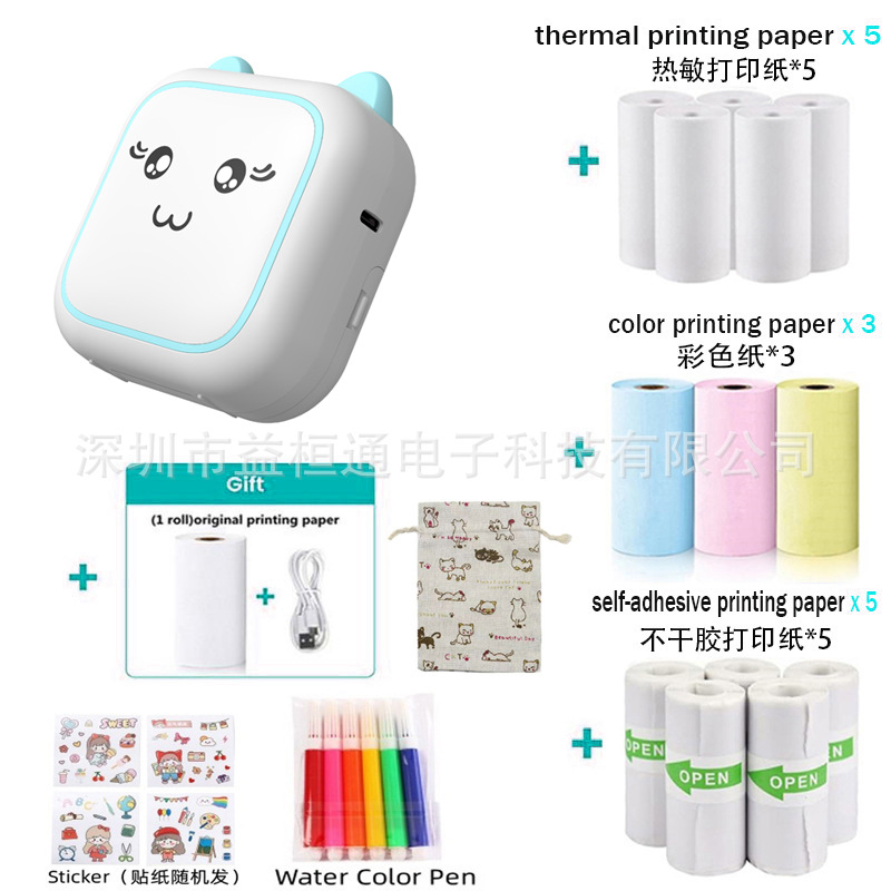 • C9 영어 흰색 파란색 + 감열지 5롤 + 자체 접착 롤 5개 + 색종이 롤 3개 + 수채화 펜 6개 + 만화 스티커 + 천 가방