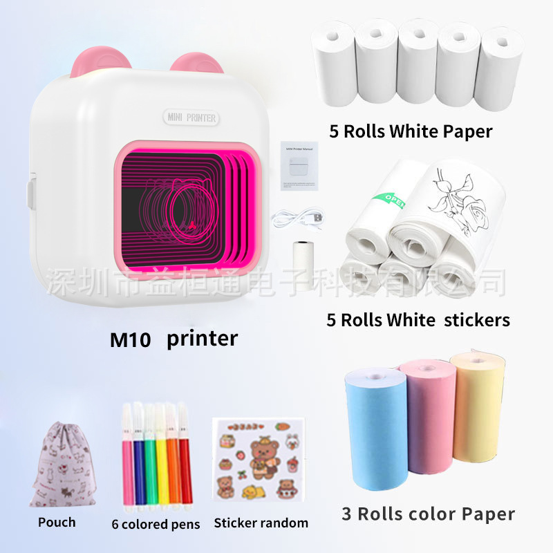• M10 영어 화이트 핑크 + 감열지 5롤 + 스티커 5롤 + 색종이 3롤 + 수채펜 6개 + 만화 스티커 + 천 가방