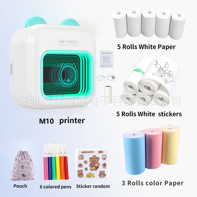 • M10 영어 흰색 파란색 + 감열지 5롤 + 자체 접착 롤 5개 + 색종이 롤 3개 + 수채화 펜 6개 + 만화 스티커 + 천 가방