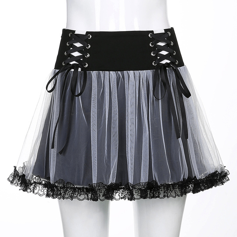 고딕 메쉬 A 라인 미니 스커트 펑크 레이스 업 하이 웨이스트 섹시 스커트