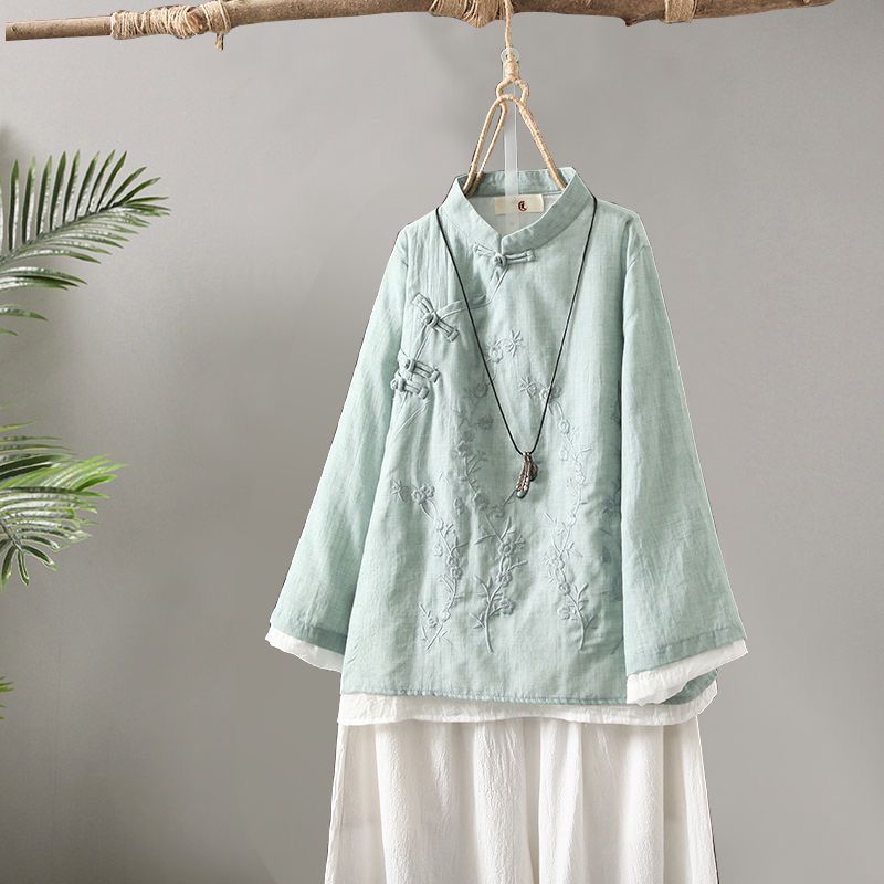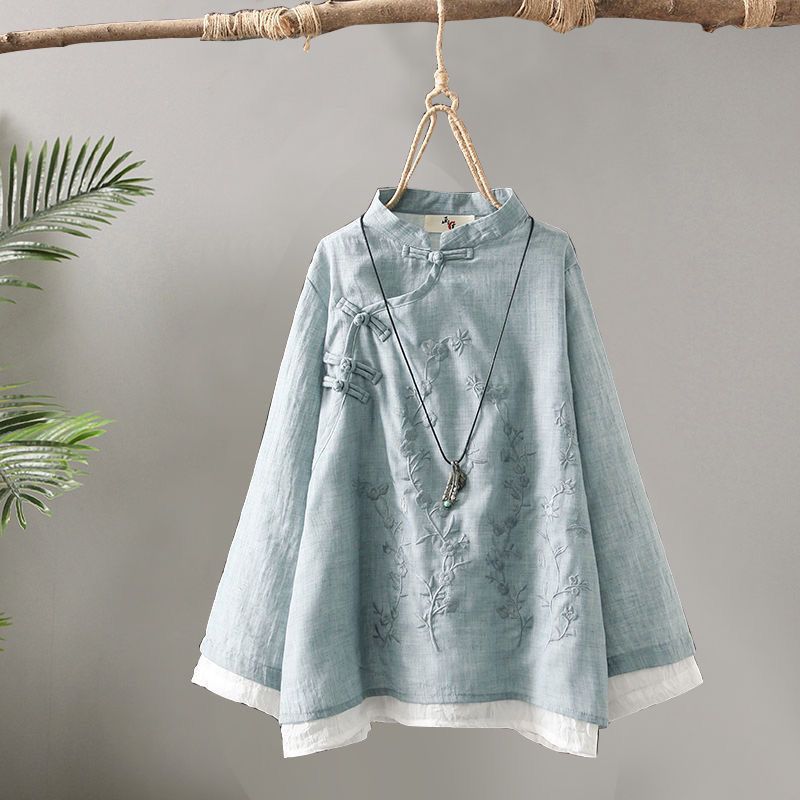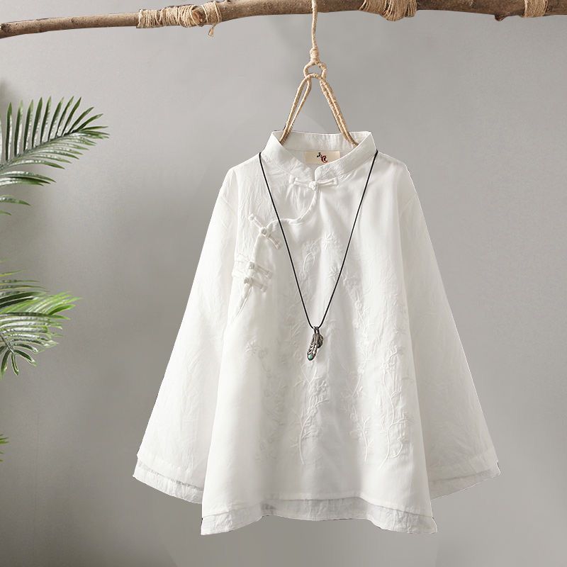 빈티지 자수 버클 코튼 셔츠 여성의 2025 봄 새로운 중국 선 차 세트 느슨한 바느질 라운드 넥 탑스토어 가기